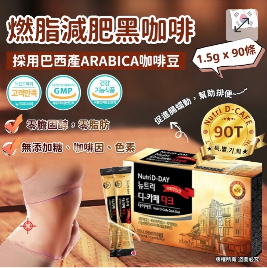 $105盒, 2盒或以上$95盒, 韓國 Nutri D-Day燃脂減肥黑咖啡 (一盒90條) ⛔截單日期:2025/11/02 06:00PM 📦預計貨到日:2026年1月中 #一路搵緊隻抵飲又有保質保證嘅減肥咖啡😎仲有瘦身效果👍👍 飲咖啡就可以減肥 絕對係咖啡人士嘅減肥恩物 ✅採用巴西產Arabica咖啡豆,咖啡味香濃 ✅加入藤黃果萃取物HCA,可抑制碳水化合物轉化成脂肪 ✅無添加糖、咖啡因、色素 ✅減少腹部皮下脂肪堆積 ✅減體重、減體脂、減內藏脂肪、減BMI ✅減少熱量攝取 ✅促進腸蠕動,幫助排便 ✅零膽固醇,零脂肪 ✅韓國食藥處GMP安全有效品質認證及健康機能食品認證 🏻飲用方法: 每日2次,每次1包;用熱水/冷水100ml沖開即可飲用。 -產地:韓國 -規格:1盒90條,每條1.5g -保存期限:2027年01月13日 ==⚠️ 聲明 ⚠️== 1.本貨品為平行進口正貨。 2.所有帖文內容只作分享及參考用途。為免混淆視聽,所有商標或版權均屬有關商品品牌商標的持有人,敬請留意。 3.空運/海運有可能因各種不明因素影響而延誤到貨,所有貨品一經訂購後,如非廠家缺貨,不設取消/退貨/換貨。 4.貨品在運輸途中導致產品包裝外盒有任何損毀凹陷,但不影響其產品本身食用/使用,或有機會不預設外盒出貨,我司不會作任何更換或退款。 5.以上資料及外盒包裝只供參考,商品外盒原廠有更換新包裝權利,一切以實物為準。 6.顏色或因拍攝器材或顯示螢幕等因素而與實物有異,以上圖片及文字僅供參考,一切以實物為準。