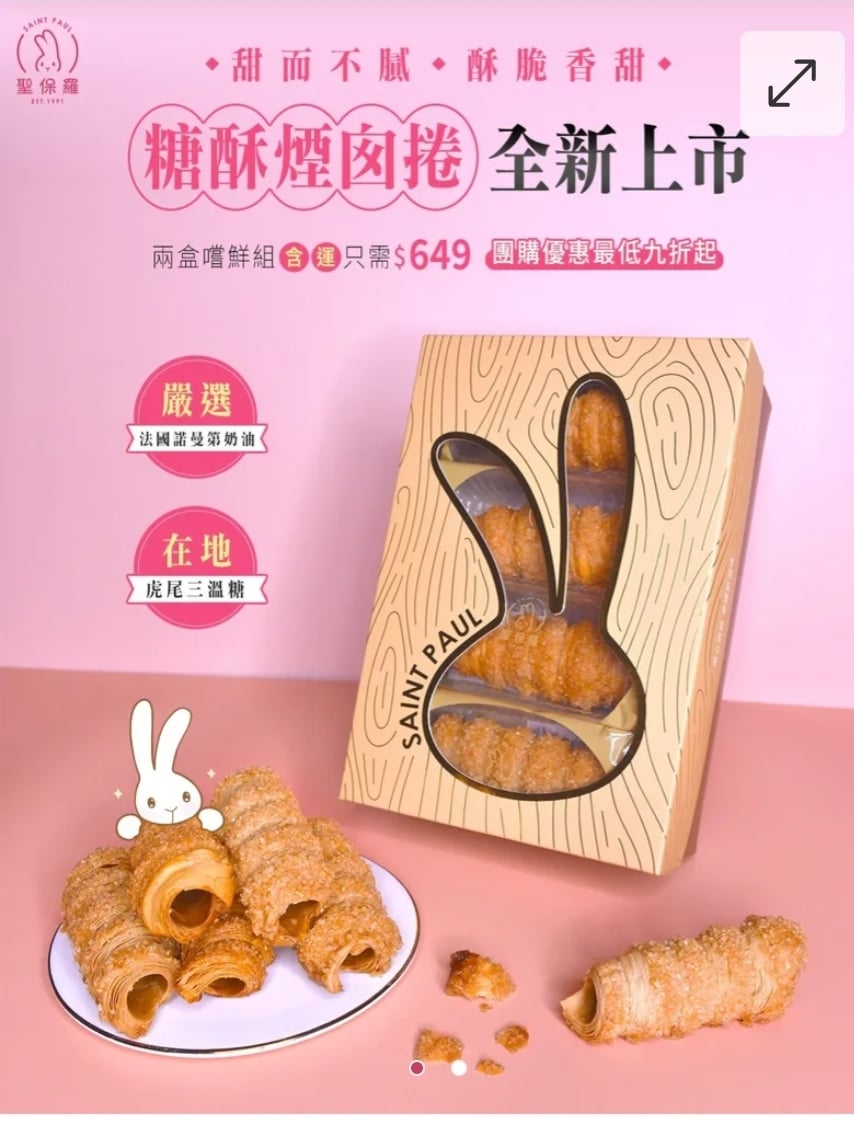 $105盒, 2盒起$95盒, 台灣聖保羅糖酥煙囪捲 (一盒8支) ⛔截單日期:2025/12/18 06:00PM 📦預計貨到日:2月頭 💢新品上市原價$,👏👏廠商提供了試吃價$盒‼️‼️ 🤩台灣同事吃了超驚艷的🎉🎉,就像蛋捲一樣,但它是一層層的千層酥的感覺,超及無敵酥脆👍👍,真的超級好吃 🧡 甜而不膩 🧡 🧡 酥脆香甜 🧡 糖酥煙肉捲源自🇩🇪德國經典甜點Trrdenk外層裏上一層特製的糖酥。 🔸使用台灣虎尾三溫糖製作 糖粒經過多次加熱熬煮,擁有獨特的焦香與細腻的甜味,讓每一口都能感受到糖殼殼酥脆帶來的美妙口感。 🔸搭配法國諾曼第奶油 奶香濃郁且滑順,為酥脆的外皮增添壹富層次。 -產地:台灣 -規格:一盒8支 -保存期限:生產日起計90天(商品銷售速度快,依實際出廠為主。) -保存方式:避免陽光直射,請置於陰涼乾燥。 -過敏原資訊: ※本產品含麩質之穀物、牛奶、蛋、大豆及其製品,不適合其過敏體質食用。 ※本產品與其它含有魚類、亞硫酸鹽、芒果、堅果與芝麻種子的產品於同一工廠生產,食物過敏者請留意。 ==⚠️ 聲明 ⚠️== 1.本貨品為平行進口正貨。 2.所有帖文內容只作分享及參考用途。為免混淆視聽,所有商標或版權均屬有關商品品牌商標的持有人,敬請留意。 3.空運/海運有可能因各種不明因素影響而延誤到貨,所有貨品一經訂購後,如非廠家缺貨,不設取消/退貨/換貨。 4.貨品在運輸途中導致產品包裝外盒有任何損毀凹陷,但不影響其產品本身食用/使用,或有機會不預設外盒出貨,我司不會作任何更換或退款。 5.以上資料及外盒包裝只供參考,商品外盒原廠有更換新包裝權利,一切以實物為準。 6.顏色或因拍攝器材或顯示螢幕等因素而與實物有異,以上圖片及文字僅供參考,一切以實物為準。