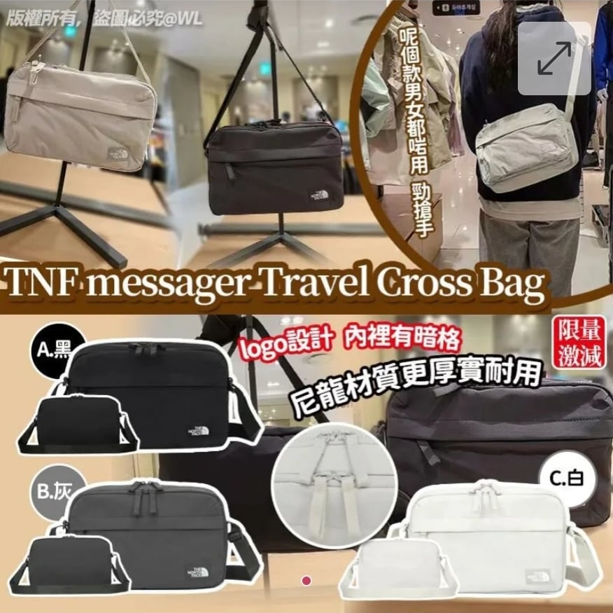 $110個, 2個或以上$99個, TNF messager Travel Cross Bag ⛔截單日期:2025/12/20 06:00PM 📦預計貨到日:2026年1月尾 A) 黑色 B) 灰色 C) 白色 #新款限定💪💪 #大熱款 限量激減 呢個款男女都啱用📣勁搶手😍 超抵用😍👇🏼‼ ✦ 產品介紹: 斜孭袋🙋♀其實容量都唔細❤ 而且非常之輕🌷尼龍材質更厚實耐用 ✅ logo設計😍 ✅內裡有暗格 📍Size: 28.5 x 19cm ==⚠️ 聲明 ⚠️== 1.本貨品為平行進口正貨。 2.所有帖文內容只作分享及參考用途。為免混淆視聽,所有商標或版權均屬有關商品品牌商標的持有人,敬請留意。 3.空運/海運有可能因各種不明因素影響而延誤到貨,所有貨品一經訂購後,如非廠家缺貨,不設取消/退貨/換貨。 4.貨品在運輸途中導致產品包裝外盒有任何損毀凹陷,但不影響其產品本身食用/使用,或有機會不預設外盒出貨,我司不會作任何更換或退款。 5.以上資料及外盒包裝只供參考,商品外盒原廠有更換新包裝權利,一切以實物為準。 6.顏色或因拍攝器材或顯示螢幕等因素而與實物有異,以上圖片及文字僅供參考,一切以實物為準。