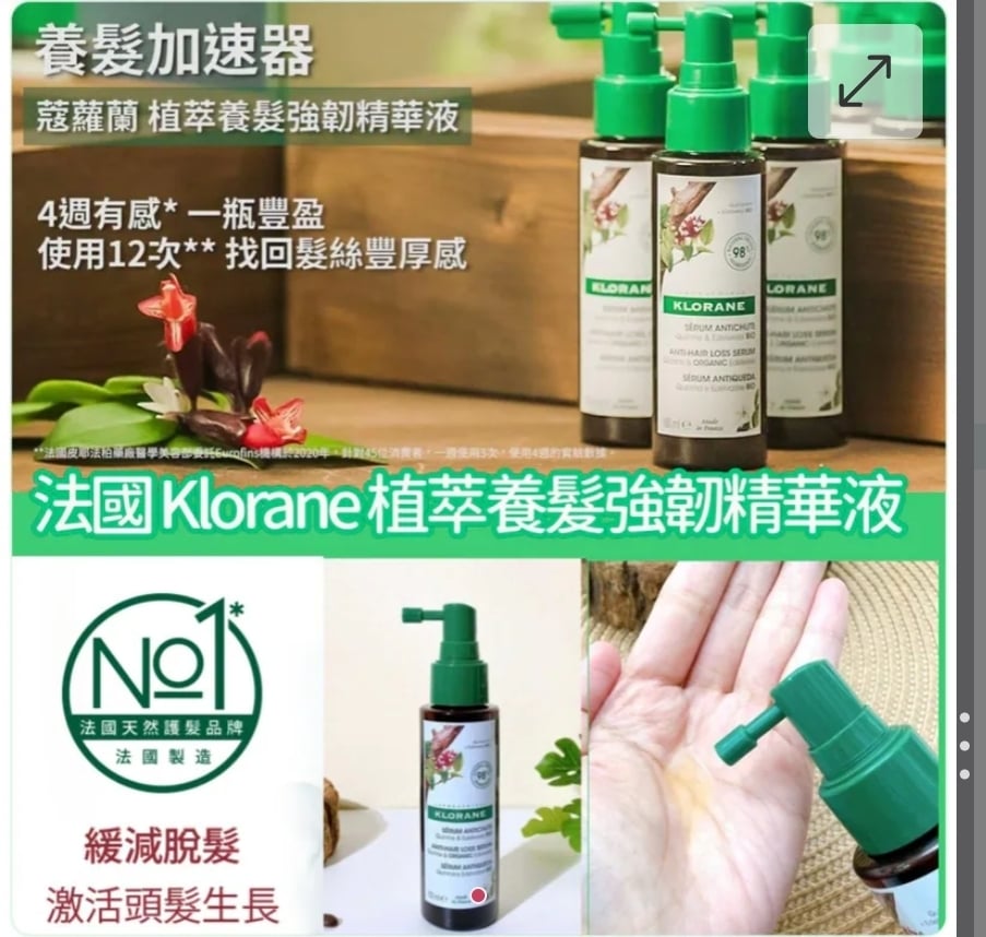 $115支. 2支或以上:$105支. 法國 KLORANE 植萃養髮強韌精華液 100ml ⛔截單日期:2025/12/29 06:00PM 📦預計貨到日: 3月頭 香港賣緊$3xx 🌼三大重點成分🌼 1.新品種金雞納樹皮萃取,協同雪絨花➕錳 ✔️促進毛髮的生長期開始,刺激頭髮生長 2. 金雞納樹皮萃取(奎寧)➕咖啡因 ✔️鞏固髮根,維持頭髮強健 3.複合維他命B ✔️提供毛髮及頭皮營養 ⭕️溫和、植萃、不刺激、快速方便(噴霧形式) ❌不添加Paraben類防腐劑、類固醇、雌激素 🌸使用方法🌸 頭髮乾時或洗完頭用毛巾擦乾後,按約10次噴灑於頭皮,可同時用手按摩頭皮幫助精華液吸收,不必沖洗 一週建議使用2-3次,一支約使用三個月 -規格︰100ml ⚠️非藥品,孕期、哺乳期可使用,男女適用⚠️ ⚠️包裝以出貨為準⚠️ ==⚠️ 聲明 ⚠️== 1.本貨品為平行進口正貨。 2.所有帖文內容只作分享及參考用途。為免混淆視聽,所有商標或版權均屬有關商品品牌商標的持有人,敬請留意。 3.空運/海運有可能因各種不明因素影響而延誤到貨,所有貨品一經訂購後,如非廠家缺貨,不設取消/退貨/換貨。 4.貨品在運輸途中導致產品包裝外盒有任何損毀凹陷,但不影響其產品本身食用/使用,或有機會不預設外盒出貨,我司不會作任何更換或退款。 5.以上資料及外盒包裝只供參考,商品外盒原廠有更換新包裝權利,一切以實物為準。 6.顏色或因拍攝器材或顯示螢幕等因素而與實物有異,以上圖片及文字僅供參考,一切以實物為準。