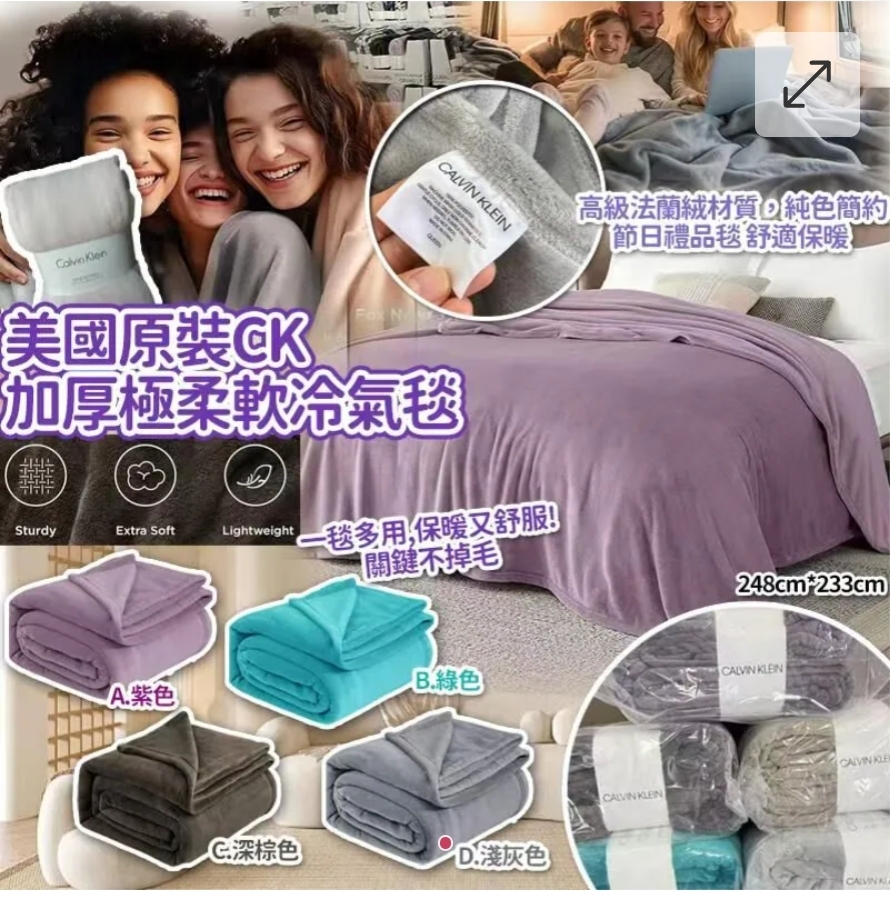 $118條. 2條或以上每條$108條. 美國原裝CK加厚極柔軟四季冷氣毯 ⛔截單日期:2025/12/19 06:00PM 📦預計貨到日: 2月頭 A)紫色 B)綠色 C)深棕色 D)淺灰色 😍高級法蘭絨材質,純色簡約 節日禮品毯💥舒適保暖🔥 ✅舒適披肩,冬季貼心午睡毯,溫暖沙發毯 ✅一毯多用的多功能毯蓋毯披肩毯讓你一整個冬天都暖心暖胃 ✅軟糯到炸的披肩毯,窩着賊舒服!被誇爆了 ✅既能做披肩又當毛毯保暖又舒服!關鍵不掉毛 材質:法蘭絨 尺寸:248cm*233cm ==⚠️ 聲明 ⚠️== 1.本貨品為平行進口正貨。 2.所有帖文內容只作分享及參考用途。為免混淆視聽,所有商標或版權均屬有關商品品牌商標的持有人,敬請留意。 3.空運/海運有可能因各種不明因素影響而延誤到貨,所有貨品一經訂購後,如非廠家缺貨,不設取消/退貨/換貨。 4.貨品在運輸途中導致產品包裝外盒有任何損毀凹陷,但不影響其產品本身食用/使用,或有機會不預設外盒出貨,我司不會作任何更換或退款。 5.以上資料及外盒包裝只供參考,商品外盒原廠有更換新包裝權利,一切以實物為準。 6.顏色或因拍攝器材或顯示螢幕等因素而與實物有異,以上圖片及文字僅供參考,一切以實物為準。