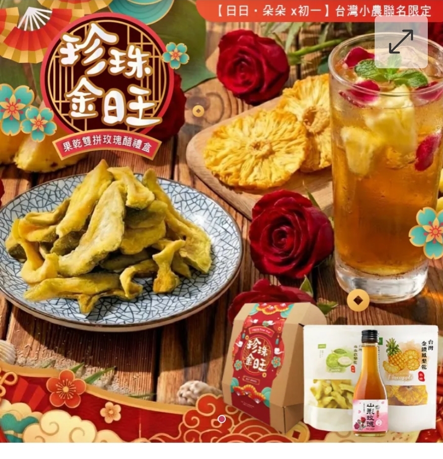 $118盒. 2盒或以上 $108盒. 2026新年日日‧朵朵 珍珠金旺果乾雙拼組盒 ⛔截單日期:2025/12/20 06:00PM 📦預計貨到日: 2月頭 🧧金旺滿滿,一盒就搞定新年祝福! 送給長輩=健康+福氣雙重祝福 日日‧朵朵 珍珠金旺果乾雙拼組盒 喝一口,酸甜清爽又健康,寓意 花開富貴、長壽康健。 每一片都是「真實水果切下去的厚實滋味」 🧧日日好運、朵朵開花、金旺滿滿🧧 🌹 山形玫瑰醋 一瓶=一整朵朵手工剝出的玫瑰精華! 再用古法自然發酵,讓花香、果酸、柔甜在舌尖綻放 💛 珍珠芭樂乾(150g) 選用在地芭樂,香氣濃、酸甜平衡。 寓意:「家家平安、步步有福」 🧡 金鑽鳳梨花果乾(無糖 90g) 金色鳳梨=金運旺、財氣來 無糖 × 原切 = 最純粹的旺年味。 整朵像花一樣綻放,過年拿出來氣勢超強! 內容物: 山形玫瑰醋180ml 珍珠芭樂乾150g 金鑽鳳梨花無糖果乾90g -產地:台灣 -規格:山形玫瑰醋180ml/珍珠芭樂乾150g/金鑽鳳梨花無糖果乾90g -保存期限:90天 -保存方式:避免陽光直射,請置於陰涼乾燥。 -過敏原資訊: ※本產品含麩質之穀物、牛奶、蛋、大豆及其製品,不適合其過敏體質食用。 ※本產品與其它含有魚類、亞硫酸鹽、芒果、堅果與芝麻種子的產品於同一工廠生產,食物過敏者請留意。 ==⚠️ 聲明 ⚠️== 1.本貨品為平行進口正貨。 2.所有帖文內容只作分享及參考用途。為免混淆視聽,所有商標或版權均屬有關商品品牌商標的持有人,敬請留意。 3.空運/海運有可能因各種不明因素影響而延誤到貨,所有貨品一經訂購後,如非廠家缺貨,不設取消/退貨/換貨。 4.貨品在運輸途中導致產品包裝外盒有任何損毀凹陷,但不影響其產品本身食用/使用,或有機會不預設外盒出貨,我司不會作任何更換或退款。 5.以上資料及外盒包裝只供參考,商品外盒原廠有更換新包裝權利,一切以實物為準。 6.顏色或因拍攝器材或顯示螢幕等因素而與實物有異,以上圖片及文字僅供參考,一切以實物為準。