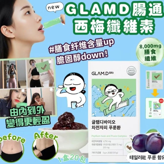 GLAMD腸通西梅纖維素(一盒20包) $125盒,2盒或以上每盒$115. 🌸新升級🆙🆙 為有小肚腩😭便秘煩惱的人士而設 從成分至效果一次過OK👌👌 含8,000mg膳食纖維有效減少膽固醇遇水會膨脹40倍增加飽腹感自然防止暴食 由內而外變得更輕盈‼‼ ✅促進排出 減小肚腩 全新添加西梅成分,膳食纖維含量增加至8,000mg! 更Slim! ✅清宿便減肚腩 #減少腰圍#高純度膳食纖維 ✔膳食纖維含量 增加145% ✔西梅成分有助排出 ✔比藥丸更細更易服用 ✔(28包/14日份量) 服用方法: 每日2包 飯前or後1包 隨水吞服 產地:韓國 截單日:限量 預計到貨日:3-4星期