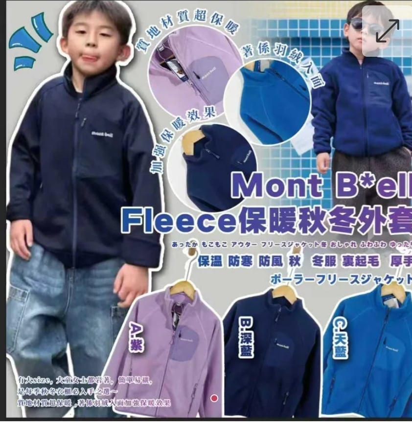 $128件. 2件或以上每件$118件。 Mont Bell搖粒絨Fleece保暖秋冬外套 ⛔截單日期:2025/10/09 06:00PM 📦預計貨到日:12月中 A) 紫 B) 深藍 C) 天藍 碼數 130/140/150/160 有大size🌈大童女士都岩著,簡單易襯,是每季秋冬衣櫃必入手之選~ 🌹質地材質超保暖 ,著係羽絨入面🌸加強保暖效果 ==⚠️ 聲明 ⚠️== 1.本貨品為平行進口正貨。 2.所有帖文內容只作分享及參考用途。為免混淆視聽,所有商標或版權均屬有關商品品牌商標的持有人,敬請留意。 3.空運/海運有可能因各種不明因素影響而延誤到貨,所有貨品一經訂購後,如非廠家缺貨,不設取消/退貨/換貨。 4.貨品在運輸途中導致產品包裝外盒有任何損毀凹陷,但不影響其產品本身食用/使用,或有機會不預設外盒出貨,我司不會作任何更換或退款。 5.以上資料及外盒包裝只供參考,商品外盒原廠有更換新包裝權利,一切以實物為準。 6.顏色或因拍攝器材或顯示螢幕等因素而與實物有異,以上圖片及文字僅供參考,一切以實物為準。