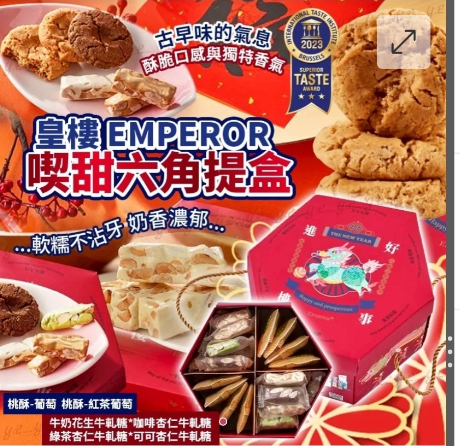 $135盒, 2盒˙或以上$125盒˙, 2026新年皇樓 EMPEROR 喫甜六角提盒 ⛔截單日期:2025/12/16 06:00PM 📦預計貨到日: 2月頭 🎁🇹🇼 皇樓 EMPEROR|喫甜六角提盒 🎁 精緻六角禮盒,一次滿足多種口味,送禮自用都超有面子! ✨ 內含多款人氣甜點: 🥛 牛奶花生牛軋糖 ×6 – 香濃牛奶+酥脆花生,甜而不膩 ☕ 咖啡杏仁牛軋糖 ×6 – 濃郁咖啡香搭配香脆杏仁 🍵 綠茶杏仁牛軋糖 ×6 – 茶香清雅,杏仁香脆,優雅口感 🍫 可可杏仁牛軋糖 ×6 – 可可濃郁,巧克力控必試 🍇 桃酥-葡萄 ×4 – 經典酥香,搭配甜美葡萄 🍵 桃酥-紅茶葡萄 ×4 – 紅茶清香+葡萄甜美,口感層次豐富 💡 皇樓喫甜提盒特色: ✔ 精緻提盒設計,送禮大方得體 ✔ 多種口味一次享受,分享給家人朋友最適合 ✔ 每款牛軋糖、桃酥都香脆不黏牙,甜而不膩 🔥 送禮自用兩相宜|皇樓精選甜點一次擁有! -產地:台灣 -規格:牛奶花生牛軋糖*6、咖啡杏仁牛軋糖*6、綠茶杏仁牛軋糖*6、可可杏仁牛軋糖*6、桃酥-葡萄*4、桃酥-紅茶葡萄*4 -保存期限:銷售速度快,依廠商出貨日為主 -保存方式:避免陽光直射,請置於陰涼乾燥 -過敏原資訊:本產品含麩質之穀物、大豆、堅果與芝麻種子其製品,不適合其過敏體質食用 ==⚠️ 聲明 ⚠️== 1.本貨品為平行進口正貨。 2.所有帖文內容只作分享及參考用途。為免混淆視聽,所有商標或版權均屬有關商品品牌商標的持有人,敬請留意。 3.空運/海運有可能因各種不明因素影響而延誤到貨,所有貨品一經訂購後,如非廠家缺貨,不設取消/退貨/換貨。 4.貨品在運輸途中導致產品包裝外盒有任何損毀凹陷,但不影響其產品本身食用/使用,或有機會不預設外盒出貨,我司不會作任何更換或退款。 5.以上資料及外盒包裝只供參考,商品外盒原廠有更換新包裝權利,一切以實物為準。 6.顏色或因拍攝器材或顯示螢幕等因素而與實物有異,以上圖片及文字僅供參考,一切以實物為準。