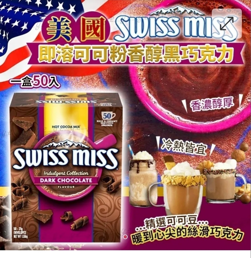$135盒50入。 2盒或以上 $125盒. 美國 Swiss Miss 即溶可可粉香醇黑巧克力 (一盒50入) ⛔截單日期:2025/11/26 06:00PM 📦預計貨到日: 2026年1月中 🍫🇺🇸 又平又好味!冬天必備嘅暖心可可登場啦~ 美國 Swiss Miss 即溶可可粉|香醇黑巧克力(50入大盒) 呢個價錢…真係唔買都對唔住自己呀!😆 ☕ Swiss Miss 點解咁紅? 因為佢係 美國國民級可可粉,冬天家家戶戶都飲返杯~ 而呢款 香醇黑巧克力版 嘅風味更加唔同: ✔ 可可味更濃郁 ✔ 甜度更剛好 ✔ 飲落滑順又唔膩 ✔ 一沖即溶,返工返學都飲到! 🍫 重點係…抵到好誇張! 👀 一盒 50 入,用數學講話畀你知: ➡ 一杯只係 $! 你係便利店買樽水都唔止啦🤣 想省荷包? 每日沖一杯當下午茶,靚到爆,又唔心痛! 📦 50入超澎湃大盒,家庭・辦公室囤貨必買! 冬天飲、OT飲、追劇飲、準備考試飲~ 隨時開一包,暖心暖胃又暖情緒 ❤️ -產地:美國 -容量:31g X 50入 -保存期限:1年 ==⚠️ 聲明 ⚠️== 1.本貨品為平行進口正貨。 2.所有帖文內容只作分享及參考用途。為免混淆視聽,所有商標或版權均屬有關商品品牌商標的持有人,敬請留意。 3.空運/海運有可能因各種不明因素影響而延誤到貨,所有貨品一經訂購後,如非廠家缺貨,不設取消/退貨/換貨。 4.貨品在運輸途中導致產品包裝外盒有任何損毀凹陷,但不影響其產品本身食用/使用,或有機會不預設外盒出貨,我司不會作任何更換或退款。 5.以上資料及外盒包裝只供參考,商品外盒原廠有更換新包裝權利,一切以實物為準。 6.顏色或因拍攝器材或顯示螢幕等因素而與實物有異,以上圖片及文字僅供參考,一切以實物為準。