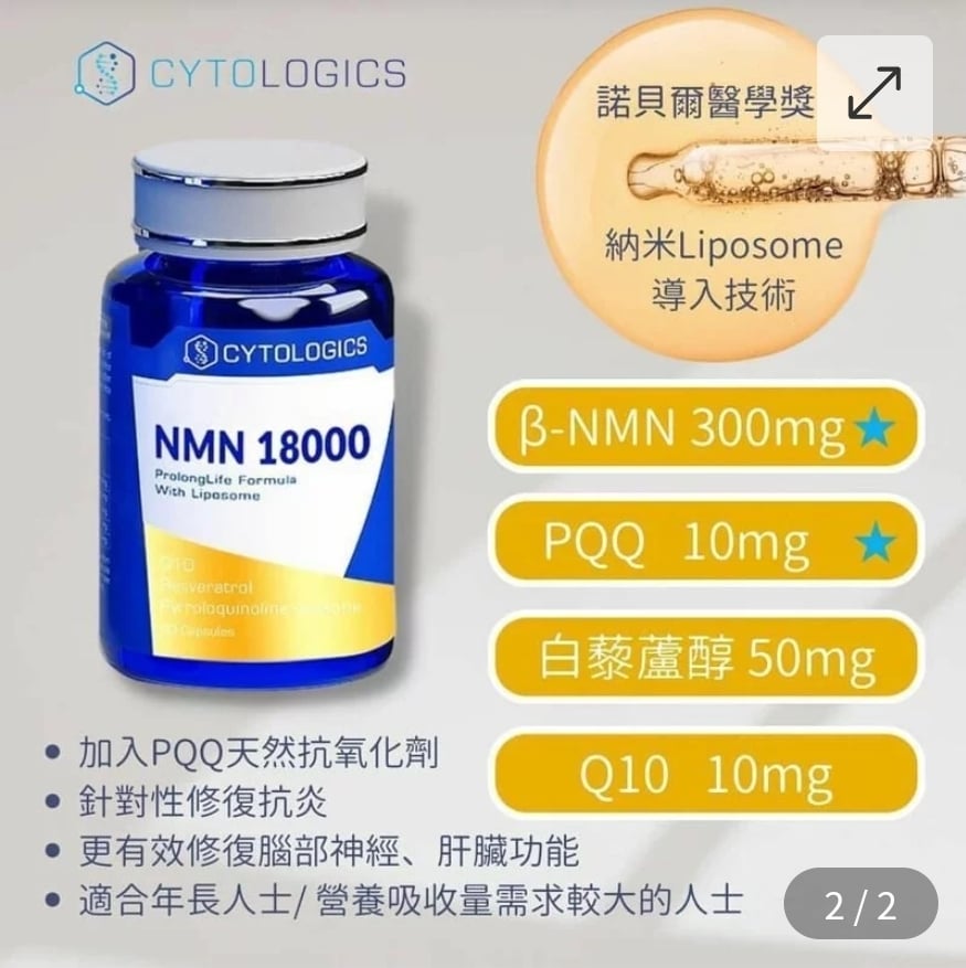$138樽。2樽起$128樽。 Cytologics β-NMN 18000 加強版一粒有300mg高純度NMN (14粒體驗裝) 限購兩樽 新配方18000強效細胞再生膠囊,Liposome + NMN +Q10+PQQ+ 白藜蘆醇 💥7日見效, 由內而外從根源修復細胞! 👑首款加入 諾貝爾醫學獎 Liposome 導入技術既NMN 納米超導入,有效及針對性的吸收 吸收程度相比同類產品, 更有效阻止被胃酸破壞而吸收率大減 👑產品結合4種活性成分:NMN、輔酶 (Q10) 和白藜蘆醇 (Resveratrol) 及PQQ的協同效應,互強互補! 👑Cytologics β-NMN 18000 加強版一粒有300mg高純度NMN,天然酶法提煉並非化學合成可比 👑加入了白藜蘆醇及Q10輔酶,另外更加入左PQQ天然抗氧化劑,更針對性修復抗炎,對腦部神經修復、肝臟功能修復更有效預防非酒精性脂肪肝! 👑生物酶法技術煉製NMN 300mg: 最直接方法提升人體內NAD+水平 白藜蘆醇50mg: 激活長壽基因Srutin、強效抗氧化,提升NAD+水平 Q10輔酶10mg: 有效對抗自由基的破壞、促進「細胞發電廠」粒線體製造、提升皮膚彈性 PQQ 10mg: 抗氧化黃金組合,修復抗炎,肝功能修復,腦力提升! 有效日期:3年 食用方法:建議早上空肚進食為佳 *50歲以下: 建議每天服用1-2粒 *50歲以上: 建議每天服用2粒 1. 整體 | 提高能量及新陳代謝 2. 睡眠 | 改善睡眠質素,提升耐力及力量,精神! 3. 肌膚 | 激活細胞修復肌膚,並且高效抗氧化,保護肌膚 4. 頭髮 | 白髮減少、頭髮增長,解決脫髮問題 5. 體重 | 增強新陳代謝,並改善胰島素分泌 6. 眼睛 | 改善乾眼症,老化,飛蚊症等 7. 腦部 | 同時強健神經系統及認知能力,加強記憶力和專注力 8. 心血管 | 修復老化血管、防止血管曲張及硬化 9. 骨骼 | 防止骨質流失、修補骨格及軟骨、舒緩關節痛 注意:請勿與抗生素同時使用。肝腎功能較弱、孕婦、哺乳、對任何成分敏感人士均不適宜食用。 如接受其他藥物治療,食用前請先諮詢你的醫生意見