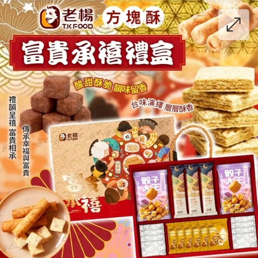 $145盒. 2盒或以上 $135盒. 老楊方塊酥富貴承禧禮盒 ⛔截單日期:2025/12/21 06:00PM 📦預計貨到日: 2月頭 迎接新春,用 老楊方塊酥富貴承禧禮盒 傳遞滿滿心意💛 經典方塊酥,每一口都是酥脆香甜,幸福感滿滿! ✅精選多種口味,滿足全家喜好 ✅酥脆口感,入口即化,香氣四溢 ✅精美包裝設計,送禮自用都大方體面 🎁 富貴承禧,象徵新年好運、富貴滿堂 無論是拜年、送禮或下午茶,都是最佳選擇 -產地:台灣 -容量: 金桔雪花酥*8塊 鹹蛋黃醇心蛋捲*4支 骰子大王甘梅地瓜*2包 鹹蛋黃肉鬆三明治*4片 -保存期限:生產計起10個月(商品銷售速度快,依實際出廠為主) ==⚠️ 聲明 ⚠️== 1.本貨品為平行進口正貨。 2.所有帖文內容只作分享及參考用途。為免混淆視聽,所有商標或版權均屬有關商品品牌商標的持有人,敬請留意。 3.空運/海運有可能因各種不明因素影響而延誤到貨,所有貨品一經訂購後,如非廠家缺貨,不設取消/退貨/換貨。 4.貨品在運輸途中導致產品包裝外盒有任何損毀凹陷,但不影響其產品本身食用/使用,或有機會不預設外盒出貨,我司不會作任何更換或退款。 5.以上資料及外盒包裝只供參考,商品外盒原廠有更換新包裝權利,一切以實物為準。 6.顏色或因拍攝器材或顯示螢幕等因素而與實物有異,以上圖片及文字僅供參考,一切以實物為準。