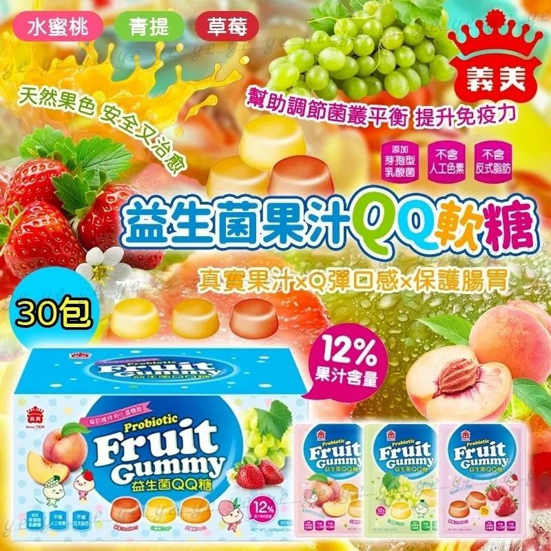 $148盒30包, 2盒或以上$138盒, 台灣義美益生菌果汁QQ軟糖(1盒30包) ⛔截單日期:2025/10/12 06:00PM 📦預計貨到日:12月中 💢💢一盒3種經典口味💢💢,每包低至 $6💥 $6💥 $6💥 款款都是大人小孩喜歡的口味😋白葡萄🍇、草莓🍓、水蜜桃🍑,軟Q香甜❤️隨手一包🍬解嘴饞又可幫助肚子長好菌💛 孩子愛吃的糖果特別添加益生菌,酸酸甜甜軟Q香甜(白葡萄🍇草莓🍓/水蜜桃🍑),,大人小孩都愛❣❣❣!小包裝食用非常便利,隨身攜帶每日補充益生菌,補充活力💪! 添加12%果汁含量,打開就能聞到濃濃果香🍇🍑🍓~~果汁含量高,軟糖Q軟,非常適合小孩食用,吃糖又健康。 ✴️ 幫助維持消化道機能 排便順暢 ✴️ 添加芽孢型乳酸菌 ✴️ 0%反式脂肪 ✴️ 無添加人工色素 ✴️ 無添加香料 ✴️ QQ好滋味 天然水果口味 ✴️ 無添加人工色素香料 好吃無負擔 :::::1套30包::::: 🍇白葡萄 x10 🍓草莓 x10 🍑水蜜桃 x10 -產地:台灣 -規格:40g X 30入 -保存期限:商品銷售速度快,依實際出廠為主。 -保存方式:避免陽光直射,請置於陰涼乾燥。 -過敏原資訊:本產品生產製程廠房,其設備或管線另有處理過敏原:芒果。 ==⚠️ 聲明 ⚠️== 1.本貨品為平行進口正貨。 2.所有帖文內容只作分享及參考用途。為免混淆視聽,所有商標或版權均屬有關商品品牌商標的持有人,敬請留意。 3.空運/海運有可能因各種不明因素影響而延誤到貨,所有貨品一經訂購後,如非廠家缺貨,不設取消/退貨/換貨。 4.貨品在運輸途中導致產品包裝外盒有任何損毀凹陷,但不影響其產品本身食用/使用,或有機會不預設外盒出貨,我司不會作任何更換或退款。 5.以上資料及外盒包裝只供參考,商品外盒原廠有更換新包裝權利,一切以實物為準。 6.顏色或因拍攝器材或顯示螢幕等因素而與實物有異,以上圖片及文字僅供參考,一切以實物為準。