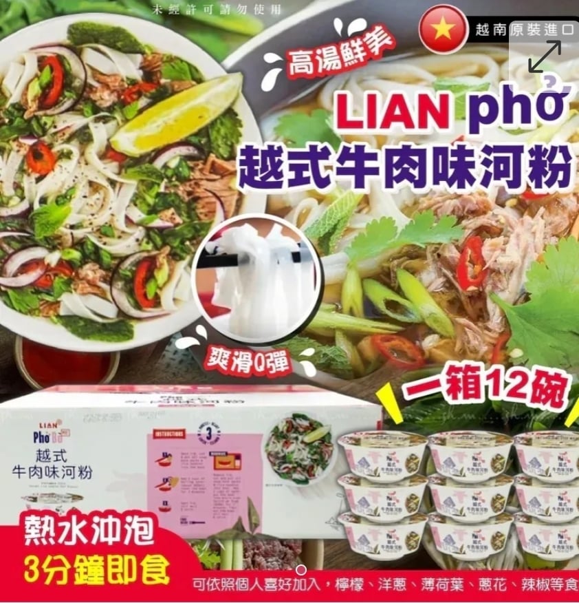 $149箱. 2箱或以上$139箱. Lian Pho Bo 即食牛肉河粉 (1箱12碗) Lian Pho Bo 即食牛肉河粉 (1箱12碗) ⛔截單日期:2025/11/12 06:00PM 📦預計貨到日:2026年1月中 🈶️🉐️補貨喇🎉🎉 呢碗越南河真♥️堅好味😋😋 無論係湯底定係個河粉,都同越南餐廳食到嘅味道一樣🤩但價錢就平過喺餐廳食多多聲😆😆 一年先補一次貨咋‼️買幾箱囤貨絕對係最皆選擇👍👍 😋3分鐘即食超方便 😋湯底濃郁唔會口渴 😋在家享受正宗越南風味 香港有好多人都好鍾意去🇻🇳越南餐廳食生牛肉河粉🍲,貪佢湯底濃郁,牛肉又夠fresh💦! 有無諗過而家響屋企3分鐘,就可以享受到一碗熱辣辣既正宗越南風味牛河?😋 ✅三分鐘食得 ✅牛肉湯度濃郁 ✅放響office 應急一流 ✅大人、小朋友都啱食 ✅大大碗食完夠曬滿足 ✅最重要——超級抵食呀 -產地:MADE IN VIETNAM -規格:1箱12碗 -保存期限:2026年05月11日或以後(商品銷售速度快,依實際出廠為主。) -保存方式:避免陽光直射,請置於陰涼乾燥。 -過敏原資訊: ※本產品含麩質之穀物、牛奶、蛋、大豆及其製品,不適合其過敏體質食用。 ※本產品與其它含有魚類、亞硫酸鹽、芒果、堅果與芝麻種子的產品於同一工廠生產,食物過敏者請留意。 ==⚠️ 聲明 ⚠️== 1.本貨品為平行進口正貨。 2.所有帖文內容只作分享及參考用途。為免混淆視聽,所有商標或版權均屬有關商品品牌商標的持有人,敬請留意。 3.空運/海運有可能因各種不明因素影響而延誤到貨,所有貨品一經訂購後,如非廠家缺貨,不設取消/退貨/換貨。 4.貨品在運輸途中導致產品包裝外盒有任何損毀凹陷,但不影響其產品本身食用/使用,或有機會不預設外盒出貨,我司不會作任何更換或退款。 5.以上資料及外盒包裝只供參考,商品外盒原廠有更換新包裝權利,一切以實物為準。 6.顏色或因拍攝器材或顯示螢幕等因素而與實物有異,以上圖片及文字僅供參考,一切以實物為準。