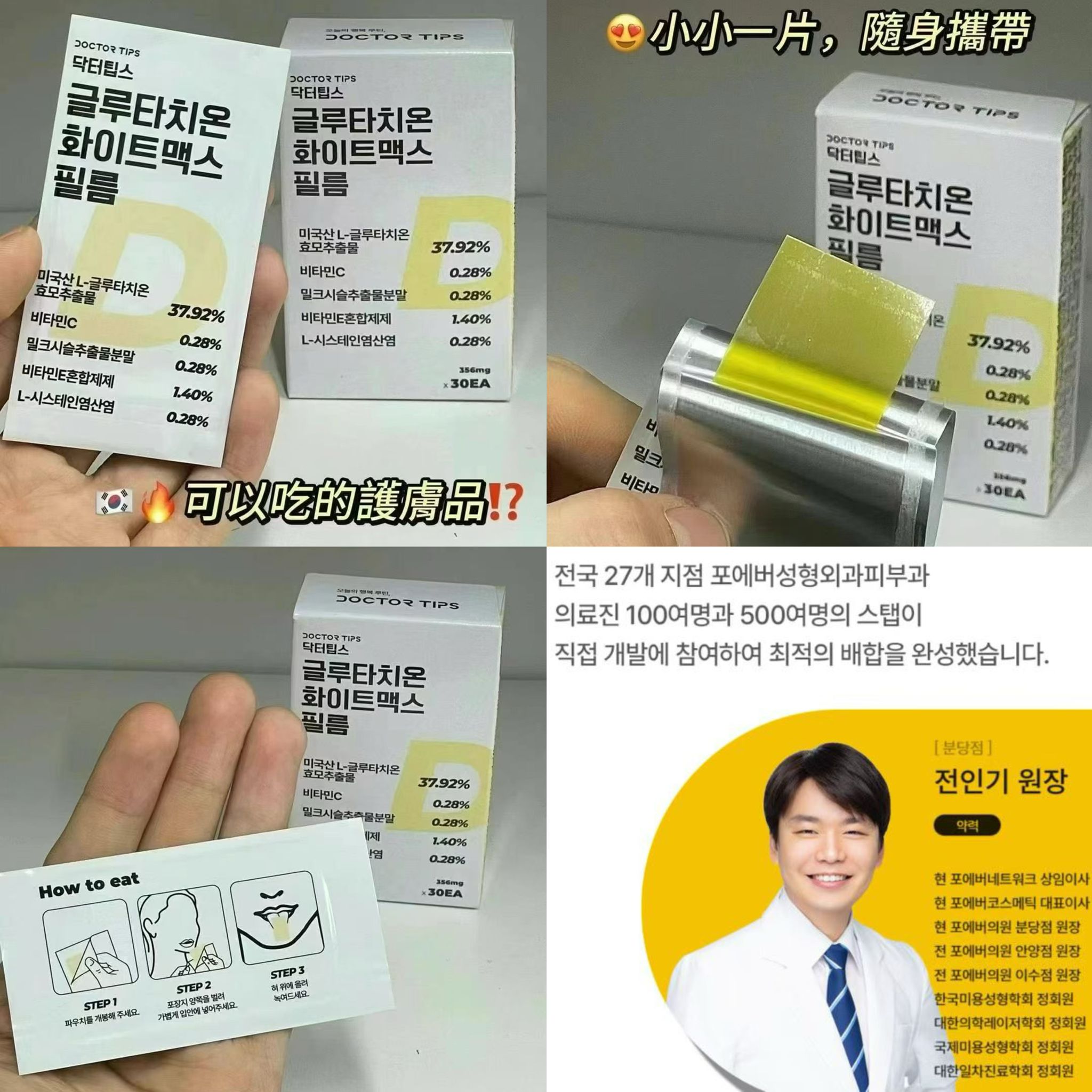 🏆韓國藥局必買🏆 全韓國27家皮膚科院長聯合研發,可以吃的護膚品❗❗❗韓國🇰🇷Doctor tips 穀胱甘肽 口含片 30片/盒 🕝收單日:15/11 ✈️到港日:3-4 weeks $155盒。2盒起$ 150盒。 🏆韓國藥局必買🏆 韓國🇰🇷Doctor tips 穀胱甘肽 口含片 30片/盒 ‼️全韓國27家皮膚科院長聯合研發,可以吃的護膚品❗❗❗ 🍀穀胱甘肽能夠幫助細胞保持正常的免疫系統功能,並具有抗氧化,整合解毒的作用,穀胱甘肽上的疏基為活性基團,容易與一些藥物,毒素等結合,使其具有整合解毒的功效,且在延緩衰老,增強免疫力,抗腫瘤等方面有顯著功效,穀胱甘肽幾乎存在於身體的每一個細胞當中。🍀韓國27家美容院院長直接參與研發,完成了最佳配比。🍀通過薄膜吸收效率更高,速度更快🍀美國產兩次發酵純度達到75%的高純度穀光甘肽🍀通過科學論文證明,口腔上顎存在大量毛細血管,將含片含于口腔上顎可以不經過消化過程和肝臟代謝,直接被毛細血管吸收,吸收效率大大提高。Tips:穀光甘肽會被消化酶分解,為了保證功效,建議不要直接吞入腹中哦。