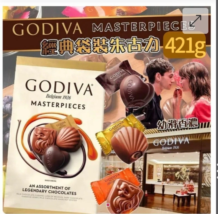 $155袋 2袋或以上:$145袋 Godiva Masterpieces 精選什錦朱古力 421g ⛔截單日期:2025/11/02 06:00PM 📦預計貨到日:2026年1月尾 大家嘅最愛❗GODIVA袋裝朱古力回歸啦❗❗今年有新包裝🤩仲係雜錦款添啊~😘😘 出面115g 都要$59,而家我地呢包421g,足足3.5倍👍 一包有齊3️⃣隻味💥包括:軟心黑朱古力,軟心焦糖,榛子軟心💥 仲要集合最受歡迎嘅幾款朱古力🍫🍫仲要係雜錦款😍 一包有晒皇牌經典心型朱古力、焦糖牛奶朱古力同埋榛子朱古力🍫 真係可以一次過滿足晒你嘅願望❗🙈🙈 每粒仲有獨立包裝🙌衛生又方便❗1袋放屋企、2袋放公司🙈🙈 幾時食都得,分享埋俾同事一齊食仲開心呀❗🤭🤭 仲等❗❓️快啲入貨啦❗😆😆 -規格︰421g -產地︰土耳其 -食用限期︰2026年6月 ==⚠️ 聲明 ⚠️== 1.本貨品為平行進口正貨。 2.所有帖文內容只作分享及參考用途。為免混淆視聽,所有商標或版權均屬有關商品品牌商標的持有人,敬請留意。 3.空運/海運有可能因各種不明因素影響而延誤到貨,所有貨品一經訂購後,如非廠家缺貨,不設取消/退貨/換貨。 4.貨品在運輸途中導致產品包裝外盒有任何損毀凹陷,但不影響其產品本身食用/使用,或有機會不預設外盒出貨,我司不會作任何更換或退款。 5.以上資料及外盒包裝只供參考,商品外盒原廠有更換新包裝權利,一切以實物為準。 6.顏色或因拍攝器材或顯示螢幕等因素而與實物有異,以上圖片及文字僅供參考,一切以實物為準。