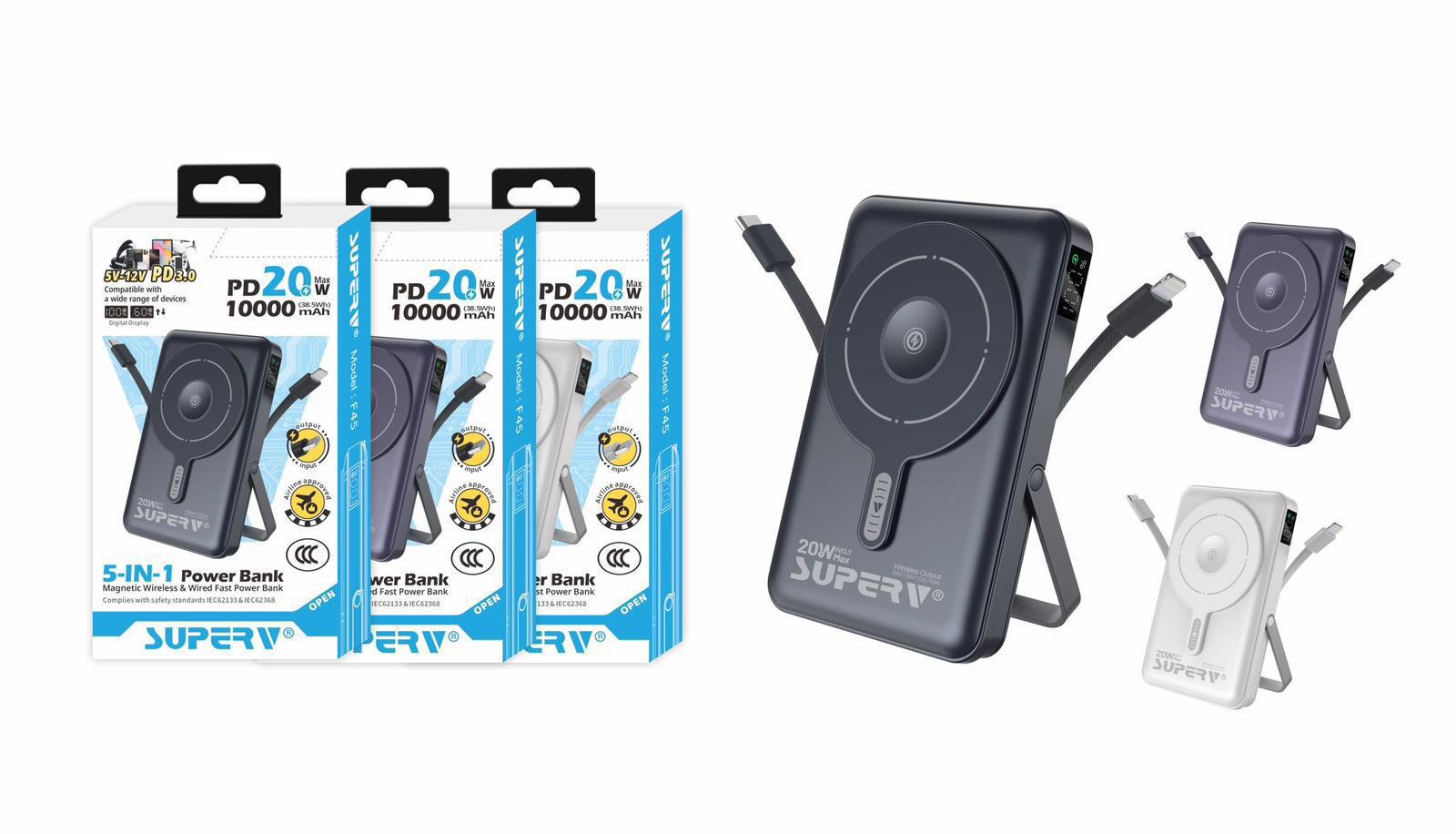 新產品 (有CCC認證)(可上機)‼️ 截單日期 : 10月15日 計到貨日期 : 11月下旬 $158件。2件起$148件。 Superv 🇭🇰 5合1 LED顯示屏無線移動電源 (MODEL: F45) 三種顏色選擇: 黑色⚫ 白色⚪ 紫色🟣 🔋支援Apple Watch+Air pod 充電 🔋自帶雙線TypeC + Lightning 🔋可4台裝置同時充電 🔋15W Magsafe無線輸出 🔋PD20W TypeC Output 🔋內置TypeC線 支援Power 輸入+輸出 🔋10000mAh大電量,可滿足日常需求 🔋設有LED電量顯示屏 🔋認證IEC62133+IEC62368 香港行貨 一年保用