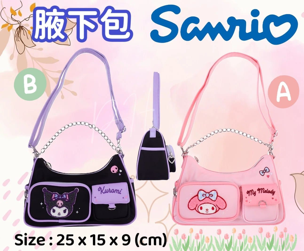 $165件。2件起$155件。 Sanrio 腋下包 🌈Sanrio 💯% 正品授權‼安心購賣🫰🏻 Sanrio 腋下包 兩款可選 A. My Melody (9-8589-1) B. Kuromi (9-8589-2) 尺寸 * 闊度: 25cm * 高度: 15cm * 深度: 9cm 物料: 聚酯纖維 - 前方印有精美刺繡章的拉鍊格及磁扣格,可擺放細小物件。 - 內𥚃口袋提供實用收納空間 - 附送可調節、可拆缷肩帶及短銀扣鏈帶,配合不同的身高需要, 鐘意單揹、側揹、斜揹、手挽亦可 - 穿上簡單配搭就可著出自己風格 截單日:限量 預計到貨日:3-4星期