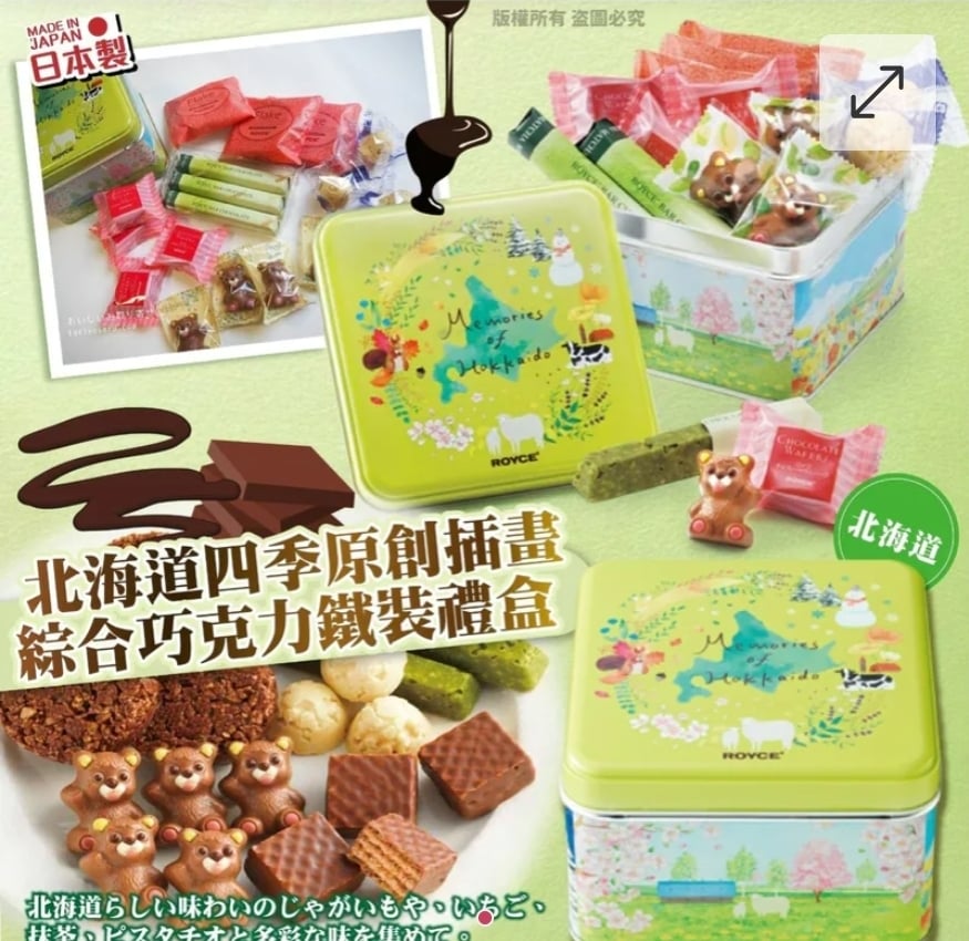 $168盒. 2盒或以上$158盒. (新年團)ROYCE 北海道.四季原創插畫-綜合巧克力鐵裝禮盒 ⛔截單日期:2025/12/20 06:00PM 📦預計貨到日: 2月頭 🇯🇵日本ROYCE 北海道四季熊熊朱古力餅乾威化餅罐裝禮盒🍪, 送禮自都好正呀‼️低至$ 盒🇯🇵😱 以北海道為印象的插圖裝滿了點心和回憶💭 以北海道的四季為印象的原創插圖的鐵罐裏🥰 配有小巧巧克力和Royce自豪的各種巧克力商品🍫🍪 罐子的4個側面分別描繪著北海道的春天🐝夏天🌱 秋天🍂冬天❄️的美麗風景和可愛的動物們🧸 一起感受感受北海道地域風情🇯🇵 ✨禮盒內容✨5種類總計18個 1️⃣小熊巧克力5個 2️⃣巧克力威化4個 3️⃣馬鈴薯白巧克力3個 4️⃣抹茶巧克力棒3個 5️⃣巧克力脆薄片3個 又精緻又特別😍 內裡最吸引嘅系開心果味熊熊朱古力🧸 加上其他ROYCE嘅精選朱古力小食🍫 係最適合不過嘅送禮佳品🎁 最佳食用限期(Best Before):出廠日計90天 ==⚠️ 聲明 ⚠️== 1.本貨品為平行進口正貨。 2.所有帖文內容只作分享及參考用途。為免混淆視聽,所有商標或版權均屬有關商品品牌商標的持有人,敬請留意。 3.空運/海運有可能因各種不明因素影響而延誤到貨,所有貨品一經訂購後,如非廠家缺貨,不設取消/退貨/換貨。 4.貨品在運輸途中導致產品包裝外盒有任何損毀凹陷,但不影響其產品本身食用/使用,或有機會不預設外盒出貨,我司不會作任何更換或退款。 5.以上資料及外盒包裝只供參考,商品外盒原廠有更換新包裝權利,一切以實物為準。 6.顏色或因拍攝器材或顯示螢幕等因素而與實物有異,以上圖片及文字僅供參考,一切以實物為準。