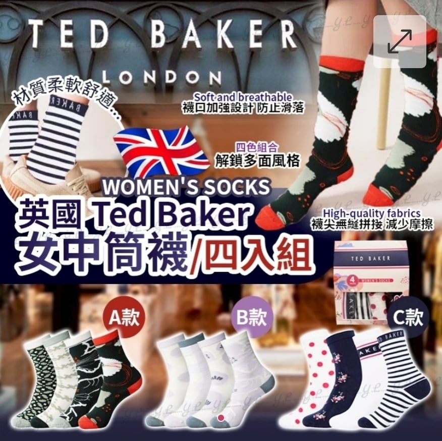 $168組. 2組或以上 $158組. 英國 Ted Baker 女中筒襪 (一組四入) ⛔截單日期:2025/11/22 06:00PM 📦預計貨到日:2026年1月中 A:俏皮風 B:低調風 C:英倫風 *若遇缺色隨機出* 🇬🇧🧦💖 英國 Ted Baker 女中筒襪|一組四入 英倫風少女感+百搭時尚,一套四對買到即係賺到! 🌈 色彩繽紛|穿搭即刻更有型 Ted Baker 出名就係高級感+獨特配色,呢套女中筒襪完全係時尚女生嘅心頭好: ✔ 配裙、短褲、球鞋=青春又亮眼 ✔ 配長褲、靴子=低調帶巧思 每日換色,點配都靚! 🧶 柔軟舒適|一穿就愛上 選用柔軟親膚材質,全天行街都唔會焗、唔會頂住腳背, 襪口仲有羅紋設計,貼合度更高、唔易滑落,日常穿著超方便! 👟 完美尺寸 ✔ 適合尺寸:US 5 – 6.5 ✔ 襪子尺寸以鞋碼為參考 彈性佳、包覆感好,穿起上腳更顯修長✨ 💝 送禮自用都好睇又實用 四入組合色系精緻,簡單又充滿英倫質感, 自用每日替換方便之餘,送比姐妹都係滿滿心意! -產地:外包裝上沒寫產地 -尺寸:單一尺寸(ONE SIZE) -規格:莫代爾纖維,尼龍,彈性纖維 ==⚠️ 聲明 ⚠️== 1.本貨品為平行進口正貨。 2.所有帖文內容只作分享及參考用途。為免混淆視聽,所有商標或版權均屬有關商品品牌商標的持有人,敬請留意。 3.空運/海運有可能因各種不明因素影響而延誤到貨,所有貨品一經訂購後,如非廠家缺貨,不設取消/退貨/換貨。 4.貨品在運輸途中導致產品包裝外盒有任何損毀凹陷,但不影響其產品本身食用/使用,或有機會不預設外盒出貨,我司不會作任何更換或退款。 5.以上資料及外盒包裝只供參考,商品外盒原廠有更換新包裝權利,一切以實物為準。 6.顏色或因拍攝器材或顯示螢幕等因素而與實物有異,以上圖片及文字僅供參考,一切以實物為準。