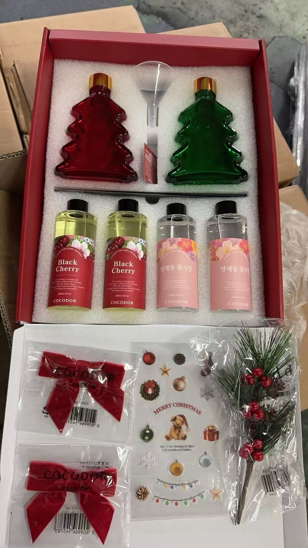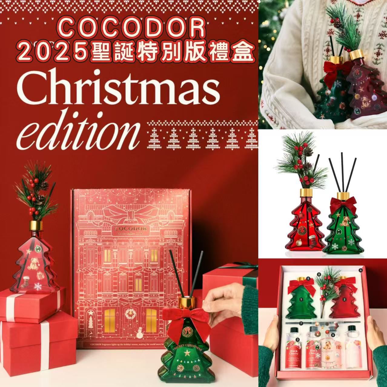 $170盒。2盒起$165盒。 COCODOR 2025聖誕特別版禮盒 11月底到 COCODOR 2025聖誕特別版禮盒: 讓饋贈時刻更特別 閃亮的裝飾、溫馨的香氣,以及一份溫暖的心意。 用 COCODOR 為您精心準備的此季禮盒, 為您珍視的人送上一份“溫暖的歲末”禮物。 禮盒內容: 1. 聖誕樹造型香薰瓶 200ml 綠色 2. 聖誕樹造型香薰瓶 200ml 紅色 · 附金色瓶蓋 2個 3. 補充液 200ml x 4瓶 4. 聖誕特別版包裝盒 (經典版) 5. 裝飾掛件 · 紅色松果掛飾 1個 / 紅色天鵝絨蝴蝶結 2個 6. DIY 貼紙 7. 藤條 10支 (黑色5支 x 2包) 8. 感謝卡 1張 味道: ·黑櫻桃 ·花卉市場 產品亮點: 亮點 01. 本身就是一份禮物的聖誕特別版包裝 採用如深紅天鵝絨般的紅色,點綴精緻的金箔細節。 即使不打開,也如同“禮物”般令人心動。 亮點 02. 充滿空間的卓越擴香力 由專業香氛品牌 COCODOR 的調香師親自嚴選高等級香原料, 經過精心調配,讓愉悅的香氣長時間瀰漫在整個空間。 亮點 03. 穀物發酵酒精基底 & 植物源提取物 採用穀物發酵酒精以及5種植物源提取物(洋甘菊、綠茶、柑橘、迷迭香、積雪草)為原料, 香氣散髮安全、無刺激,柔和而持久。 ——— COCODOR 經典香型組合: 黑櫻桃 & 花卉市場 我們將最受歡迎的兩款香調融入一次嗅覺體驗。 味道 —黑櫻桃: 前調: 青蘋果, 橙子 中調: 無花果葉, 黑櫻桃 後調: 麝香, 天芥菜 成熟黑櫻桃的深邃魅力,融合無花果的清新,營造出甜美而迷人的香氣。 味道 —花卉市場: 前調: 蘋果, 甜橙 中調: 玫瑰, 木蘭花, 小蒼蘭 後調: 琥珀, 檀香木, 麝香 彷彿捧在手中的小花束,充滿活力的生機,帶來如漫步於自然花叢中的清新花香。
