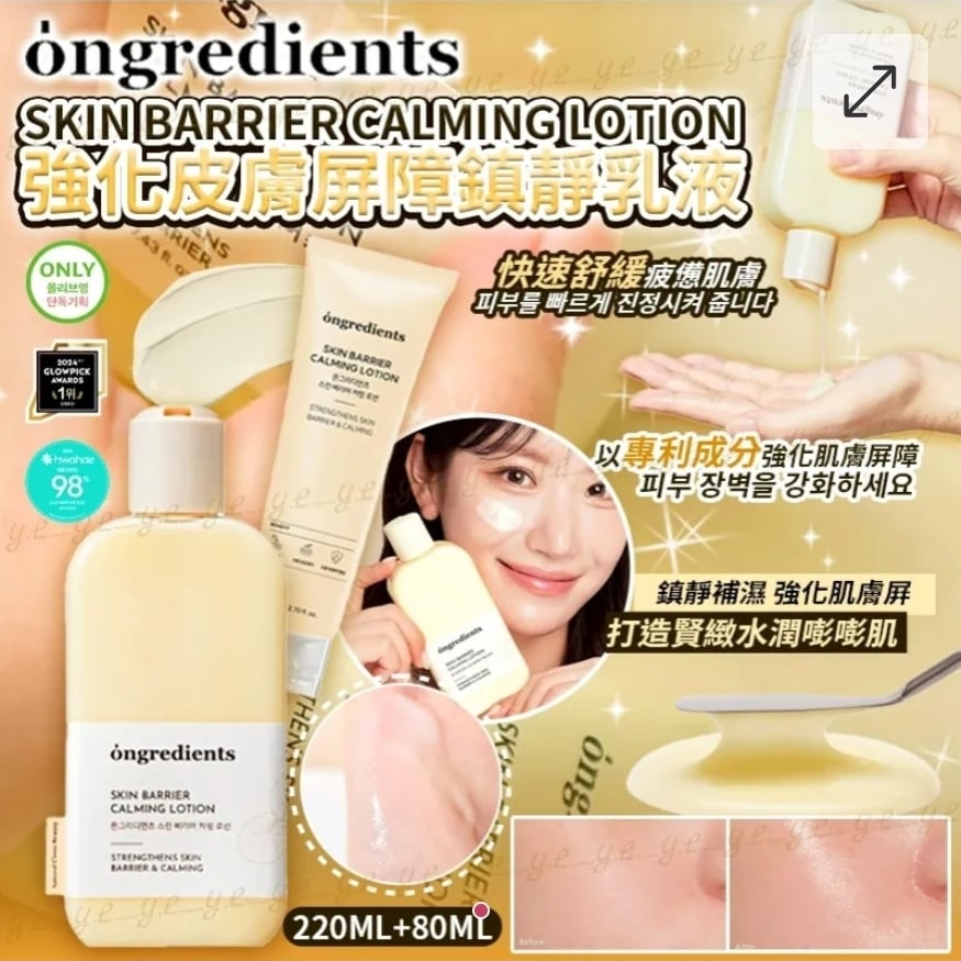 $175套. 2套或以上 $165套. 韓國 Ongredients 強化皮膚屏障鎮靜乳液 (220ml+80ml) ⛔截單日期:2025/12/23 06:00PM 📦預計貨到日:2月中 韓國知名化妝師HAPPYRIM推薦的乳液 是適合乾膚及混肌人使用的好物!! 讓你底妝不卡粉👌👌 睡前厚敷還可以當晚安面膜 改善水分流失率達84.72% 水分保濕提升77.35% 核心成份 ✅九種胜肽複合物 強效滋潤能在肌膚表層形成保濕保護膜 ✅專利成分 NB P-Complex 有效補水,瞬間加強保濕讓肌膚飽滿滋潤 ✅積雪草與黃連根萃取物 舒緩修護受損細胞,強化代謝穩膚有感 ✅Vegan 純素認證 敏敏肌也能安心使用 不只是妝前保養打底 夜間厚塗增加保濕滋潤度做為晚安面膜也是效果極佳 妝前在化妝水後即可使用 上臉後記得先讓它吸收一下成膜後再上粉底 -產地:韓國 -規格:220ml+80ml -保存期限:商品銷售速度快,依實際出廠為主。 -保存方式:避免陽光直射,請置於陰涼乾燥。 -注意事項: ※請確保將產品放在孩童和寵物接觸不到的地方。 ※使用後如有不適,請暫停使用並諮詢專業醫師。 ※如不小心噴到眼睛,請用清水沖洗10-15分鐘後,請立即就醫諮詢專業醫師。 ==⚠️ 聲明 ⚠️== 1.本貨品為平行進口正貨。 2.所有帖文內容只作分享及參考用途。為免混淆視聽,所有商標或版權均屬有關商品品牌商標的持有人,敬請留意。 3.空運/海運有可能因各種不明因素影響而延誤到貨,所有貨品一經訂購後,如非廠家缺貨,不設取消/退貨/換貨。 4.貨品在運輸途中導致產品包裝外盒有任何損毀凹陷,但不影響其產品本身食用/使用,或有機會不預設外盒出貨,我司不會作任何更換或退款。 5.以上資料及外盒包裝只供參考,商品外盒原廠有更換新包裝權利,一切以實物為準。 6.顏色或因拍攝器材或顯示螢幕等因素而與實物有異,以上圖片及文字僅供參考,一切以實物為準。