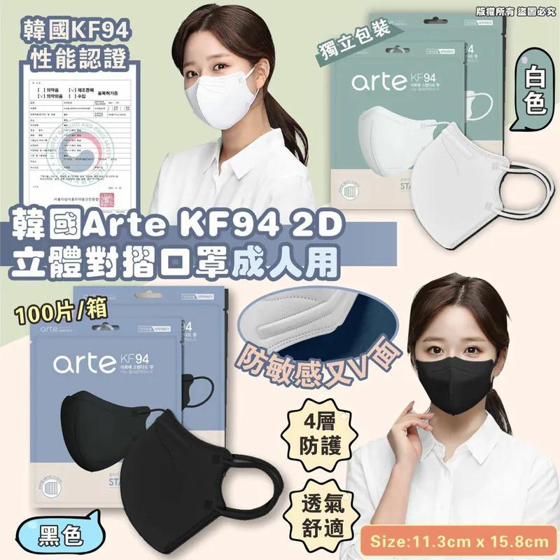 $175盒.2盒或以上:$165盒.韓國Arte KF94 2D立體對摺口罩成人用(1盒100個獨立包裝)
