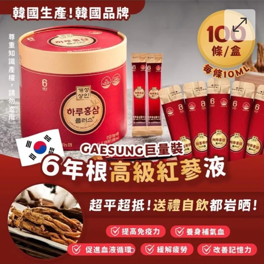 $178罐. 2罐或以上:$168罐. 韓國巨量裝6年根高級紅蔘液100條 ⛔截單日期:2025/12/16 06:00PM 📦預計貨到日: 2月尾 ⭐升級巨量裝👍 🥇100年老牌6年根紅蔘濃縮液,韓國生產.韓國品牌 🉐1罐100條,每條10ml,3個月份量 🉐每日一條,方便攜帶,乾淨衛生 ✅使用6年根紅蔘液 ✅提高免疫力 ✅改善疲勞 ✅改善記憶力 ✅通過抑制血小板凝集來促進血液流動 ✅有助補氣血、緩解疲勞 -規格:1罐100條,每條10ml -產地:韓國 ==⚠️ 聲明 ⚠️== 1.本貨品為平行進口正貨。 2.所有帖文內容只作分享及參考用途。為免混淆視聽,所有商標或版權均屬有關商品品牌商標的持有人,敬請留意。 3.空運/海運有可能因各種不明因素影響而延誤到貨,所有貨品一經訂購後,如非廠家缺貨,不設取消/退貨/換貨。 4.貨品在運輸途中導致產品包裝外盒有任何損毀凹陷,但不影響其產品本身食用/使用,或有機會不預設外盒出貨,我司不會作任何更換或退款。 5.以上資料及外盒包裝只供參考,商品外盒原廠有更換新包裝權利,一切以實物為準。 6.顏色或因拍攝器材或顯示螢幕等因素而與實物有異,以上圖片及文字僅供參考,一切以實物為準。