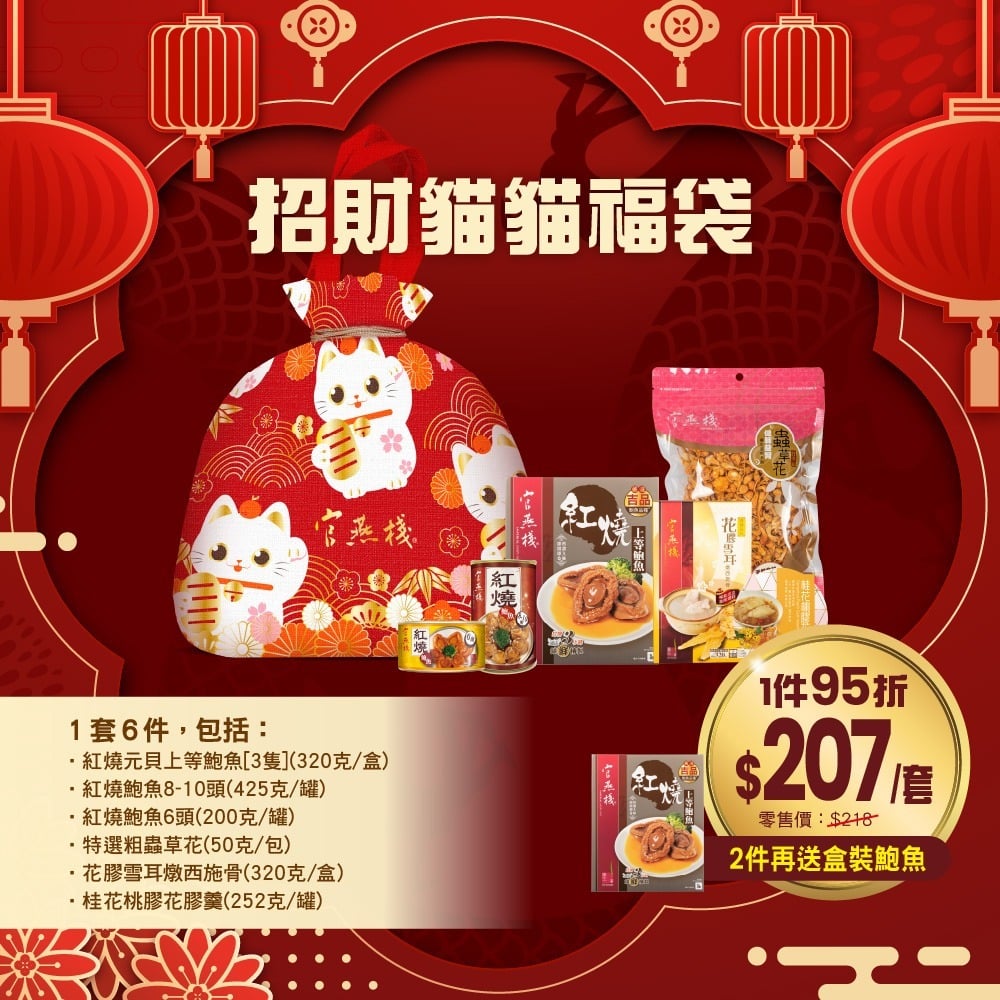 $217袋。2袋起$207袋。 A02 - 招財貓貓福袋 約2weeks 福袋 (1套6件)包括: * 紅燒上等鮑魚(3頭)(280克/盒) * 紅燒一品鮑魚8-10頭 (425克/罐) * 紅燒鮑魚6頭(200克/罐) * 天然厚花菇(227克/包) * 特選粗蟲草花(50克/包) * 美國原枝花旗參茶(10包/盒) ~2件送3頭紅燒上等鮑魚(280克)