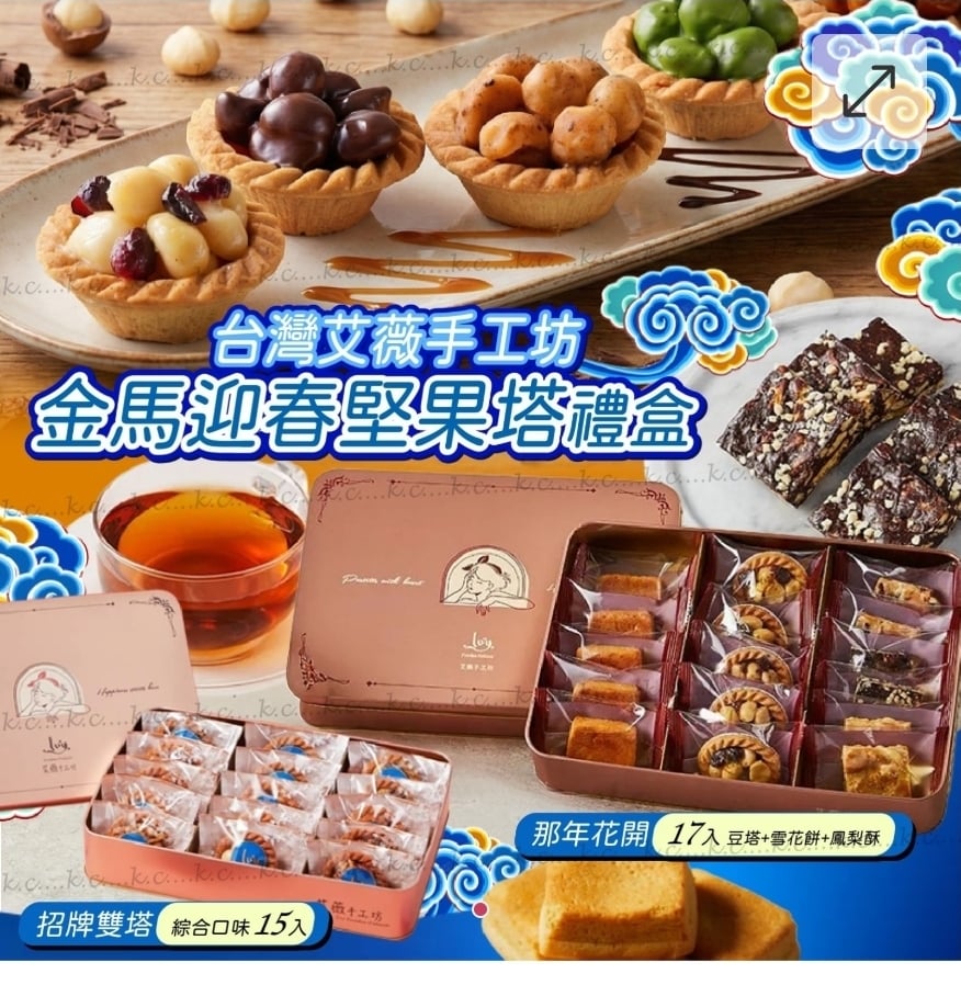 $228盒, 2盒或以上 $218盒, 艾薇手工坊金馬迎春堅果塔禮盒 ⛔截單日期:2025/12/21 06:00PM 📦預計貨到日: 2月頭 A.招牌雙塔15入 B.那年花開17入 迎接新春,就要用 艾薇手工坊金馬迎春禮盒,送禮自用都超體面💛 💎 A. 招牌雙塔 15入 艾薇最熱銷的招牌商品,結合兩款人氣塔類: 夏威夷豆塔:奶香濃郁,豆子清脆可口,明星商品必試! 堅果塔:夏威夷豆、腰果、杏仁、核桃混合,營養滿分,口感豐富,老少咸宜 ✨ 每種塔類有 5種口味,共10種口味一次品嚐,視覺與味覺雙重享受! 🎁 最適合喜愛嚐鮮的你,也是送禮首選 💎 B. 那年花開 17入 精選招牌 夏威夷豆塔 – 蜂蜜蔓越莓豆塔,酸甜滋味完美平衡 搭配雪花餅外酥內軟、鳳梨酥香酥內餡恰到好處,每一口都是層次享受 🎁 精緻鐵盒禮盒,組合豐富,送禮大方體面 🌟 無論自用還是送禮,新春送上 艾薇手工坊金馬迎春禮盒,讓親友開心迎新年! -產地:台灣 -容量: A.招牌雙塔15入 夏威夷豆塔→蜂蜜蔓越莓口味x2、焦糖口味x2、巧克力口味x2、抹茶口味x2、椒麻口味x2 堅果塔→蜂蜜口味x1、焦糖口味x1、巧克力口味x1、咖哩口味x1、海苔口味x1 (一盒共有15入塔) B.那年花開17入 夏威夷豆塔→蜂蜜蔓越莓口味x5 雪花餅→蔓越莓x2、巧克力x2、金沙x2 酥餅類→土鳳梨酥x3、鳳凰酥x3 -保存期限:生產計起30天(商品銷售速度快,依實際出廠為主) ==⚠️ 聲明 ⚠️== 1.本貨品為平行進口正貨。 2.所有帖文內容只作分享及參考用途。為免混淆視聽,所有商標或版權均屬有關商品品牌商標的持有人,敬請留意。 3.空運/海運有可能因各種不明因素影響而延誤到貨,所有貨品一經訂購後,如非廠家缺貨,不設取消/退貨/換貨。 4.貨品在運輸途中導致產品包裝外盒有任何損毀凹陷,但不影響其產品本身食用/使用,或有機會不預設外盒出貨,我司不會作任何更換或退款。 5.以上資料及外盒包裝只供參考,商品外盒原廠有更換新包裝權利,一切以實物為準。 6.顏色或因拍攝器材或顯示螢幕等因素而與實物有異,以上圖片及文字僅供參考,一切以實物為準。