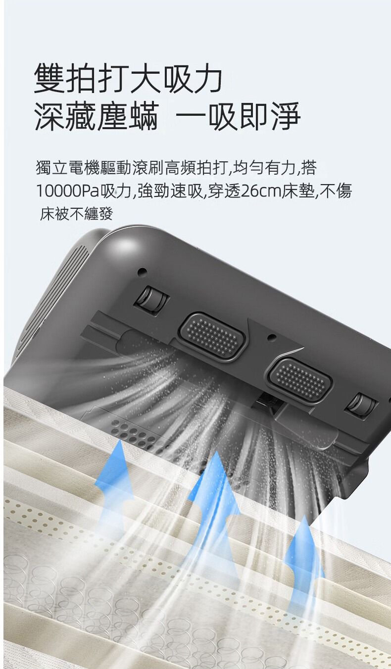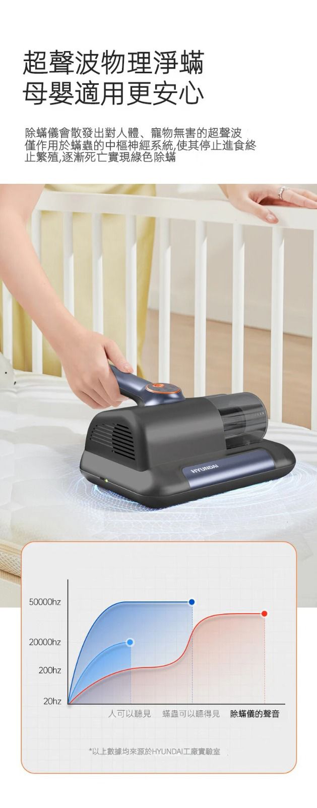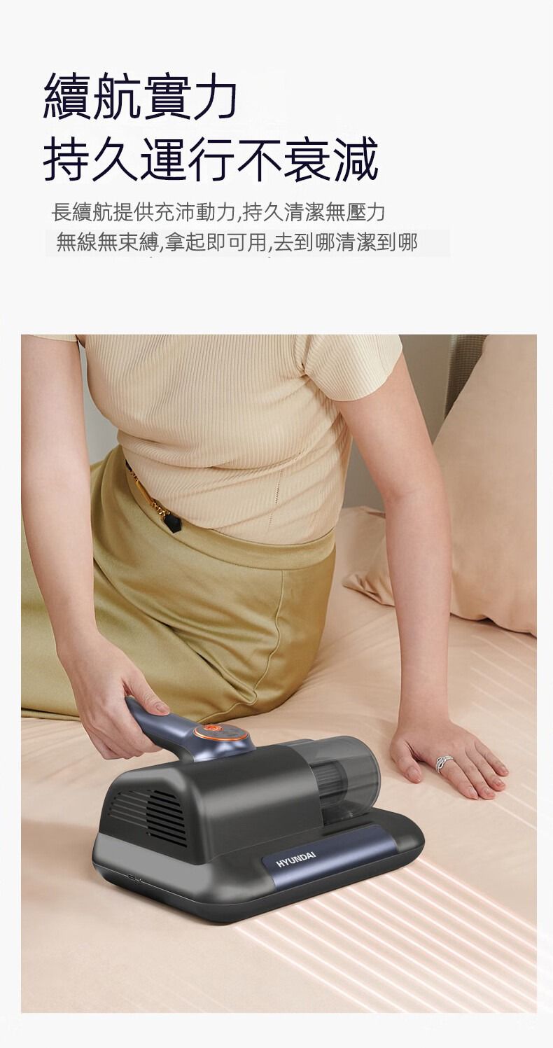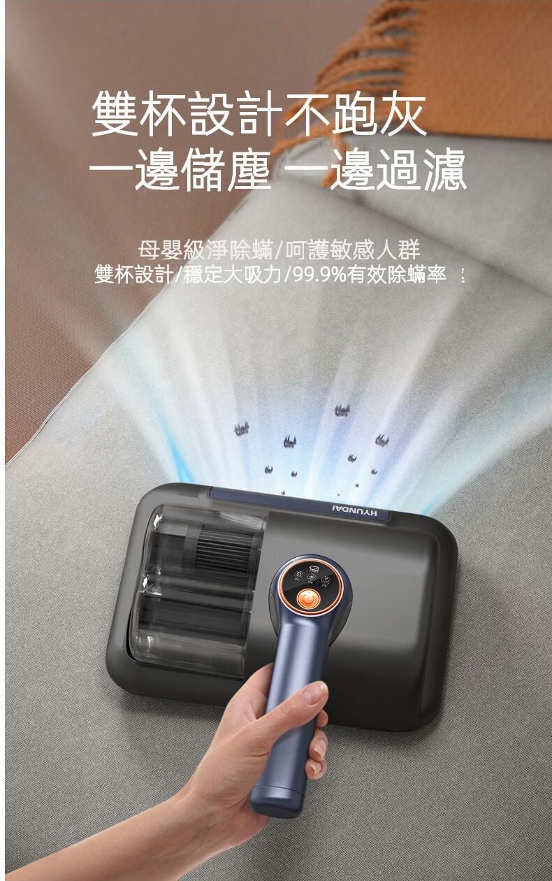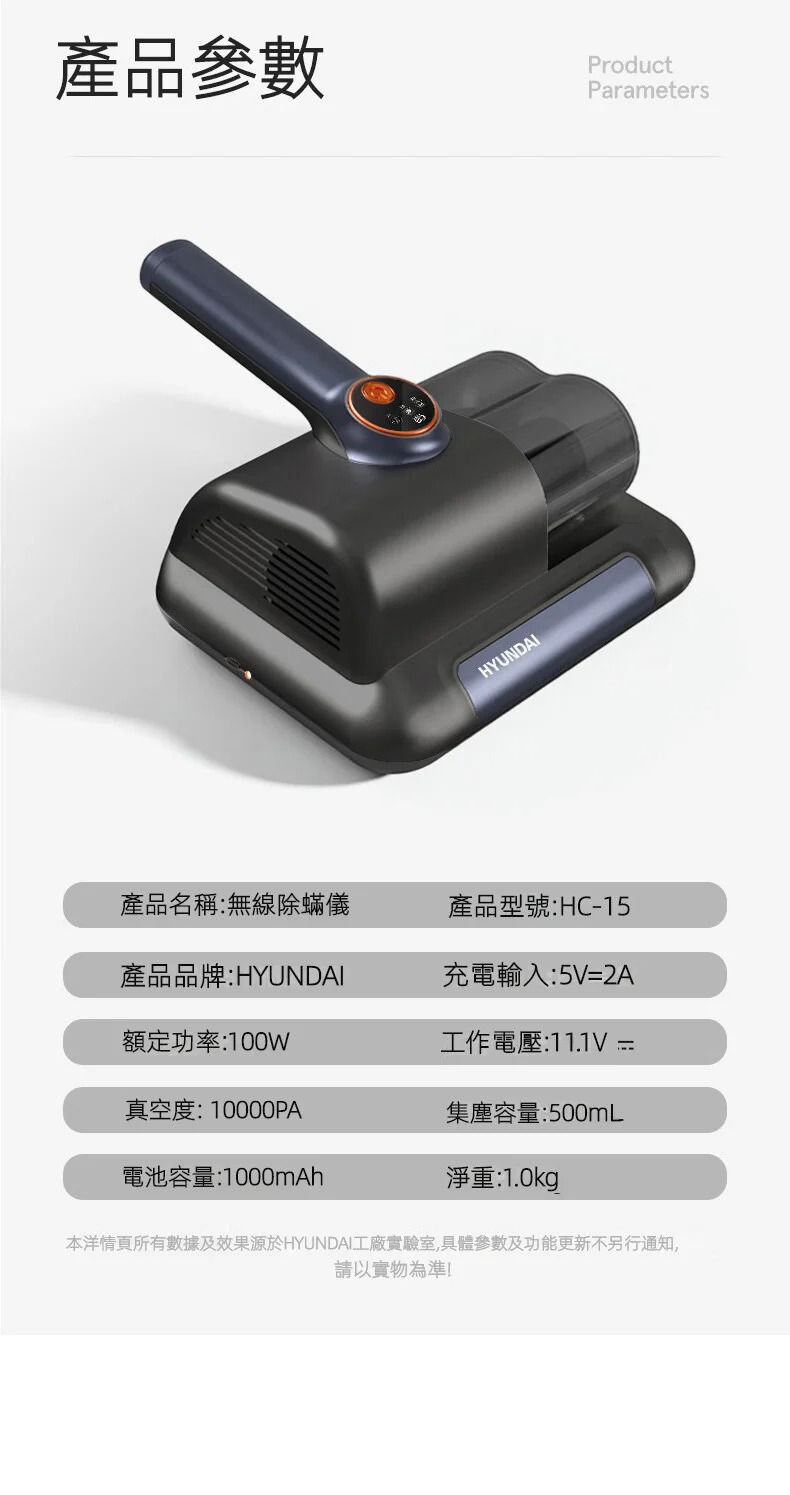 截單日期 : 11月18日 預計到貨日期 : 1月尾 嚟緊秋冬啲被拎出嚟,最緊要密啲手吸塵蟎啊 吸塵蟎淨係吸唔夠架、重要係拍打 、呢款仲要雙拍打、大吸力、紫外光燈殺菌 $228部。 Hyundai HC-15 無線塵蟎機 Hyundai HC-15 是一款無線塵蟎機,它具有雙杯雙拍打功能,利用紫外線殺滅塵蟎,並能以 (10000Pa\) 的吸力深層清潔床墊。這款產品無線設計,重量輕巧,並配有 LED 螢幕和獨立馬達驅動的滾刷。 主要特色 強勁吸力: 擁有 \(10000Pa\) 的吸力,能深入床墊深處,有效清除塵蟎。雙重拍打: 內建獨立電機驅動的滾刷,能夠高頻拍打,將深藏的塵蟎震出。紫外線殺菌: 配備紫外線 (UV) 燈,進一步殺滅塵蟎和其他過敏原。無線輕巧: 無線設計讓使用更靈活,機身重量僅約 \(1.0kg\)。LED 顯示: 提供 LED 螢幕,方便查看清潔狀態和檢測結果。 平行進口、只提供3個月保養 香港三腳插頭