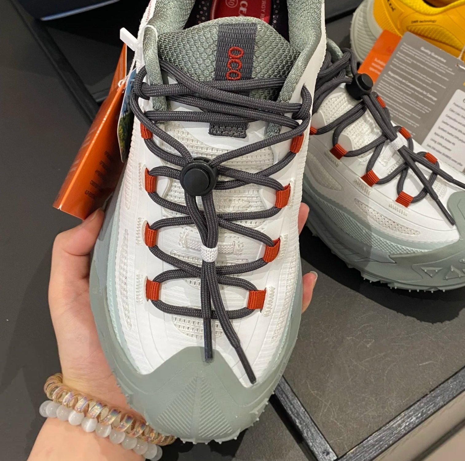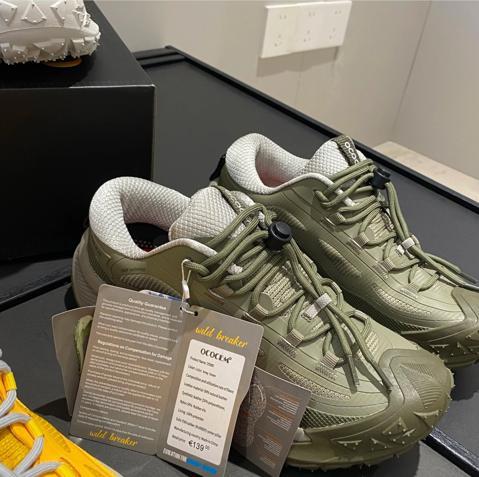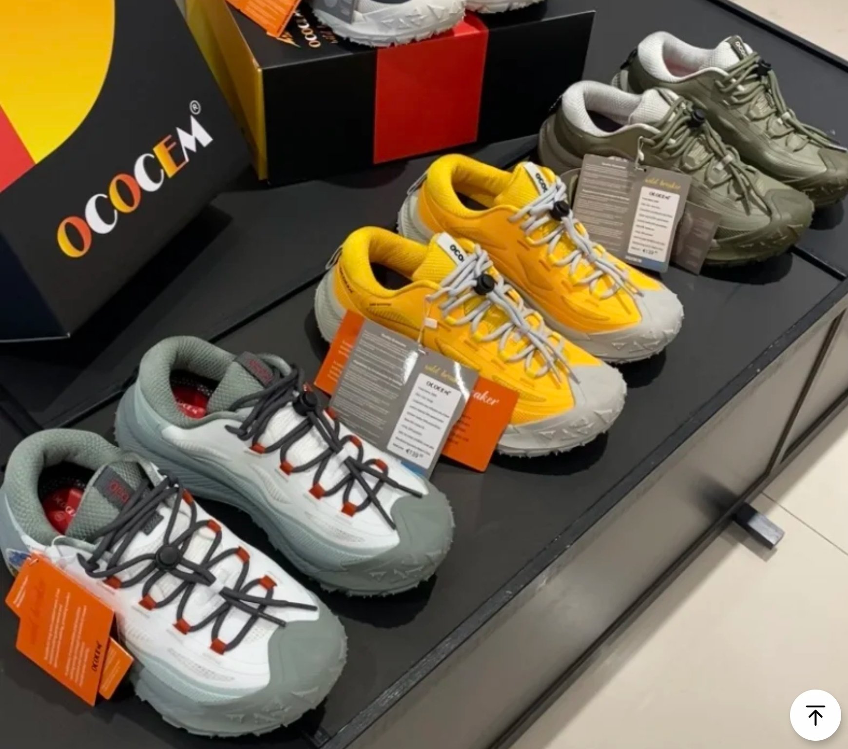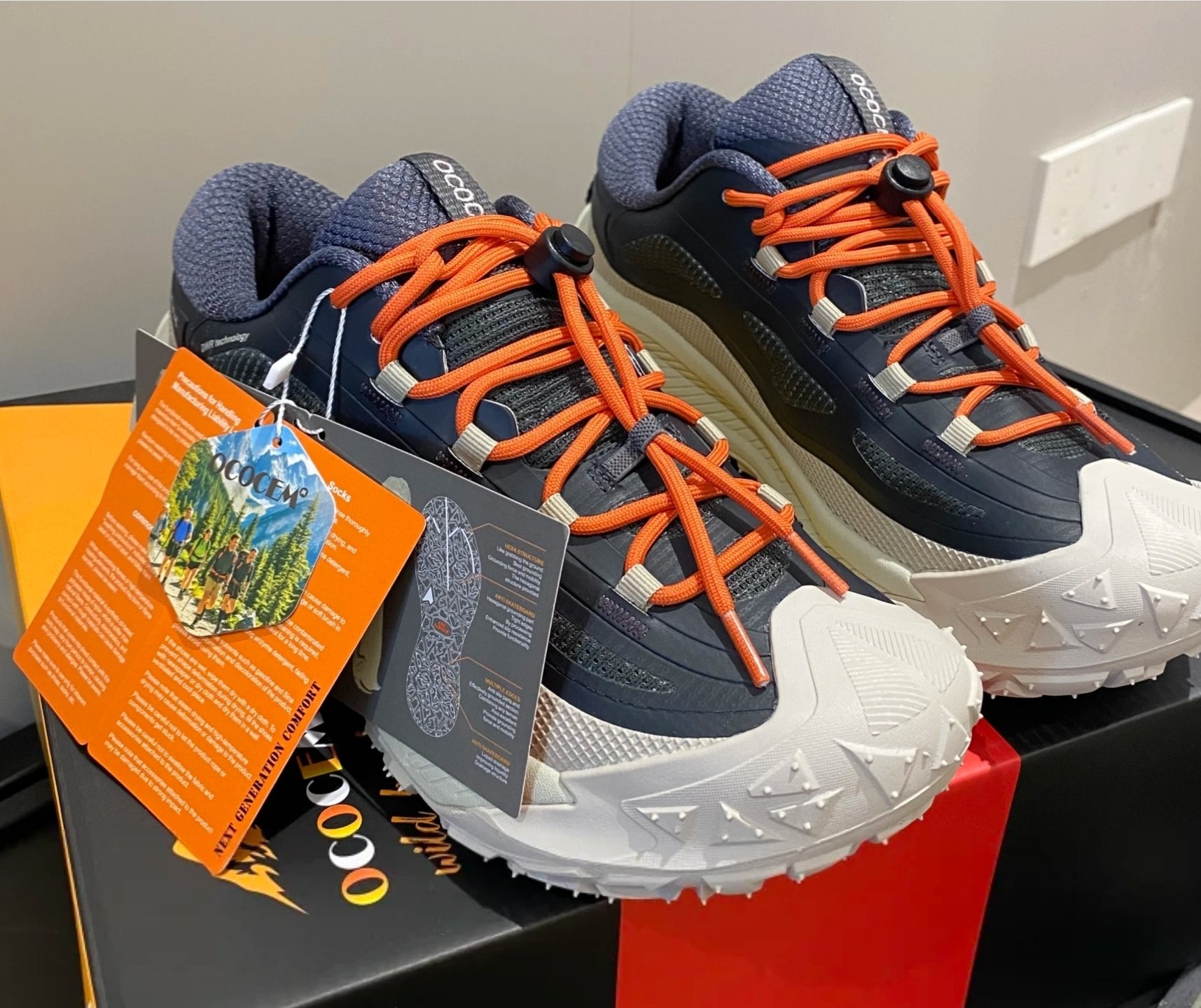 $250對。 原單OCOCEM® Wild Breaker 系列登山越野鞋, 主打「Next Generation Comfort」— 為戶外運動及城市穿搭而設,集防滑、防水、輕量、透氣於一身。以下係詳細介紹👇 🌄【產品名稱】 OCOCEM® Wild Breaker DWR Hiking Shoes 🧩【設計亮點】 立體防撞鞋頭設計:前端加厚橡膠防護,保護腳趾免受撞擊。 DWR防潑水科技面料:有效阻隔雨水滲入,保持鞋面乾爽。 高彈EVA中底:長時間步行減震舒適,適合長途行山或日常穿著。 特殊防滑大底 (SBR Rubber Sole):超深齒紋+突起防滑釘,加強抓地力,應付濕滑泥地、碎石路面。 快扣彈力鞋帶系統:一拉即緊,方便穿脫,不鬆脫。 透氣內襯 + 加厚鞋舌設計:提升包覆感及透氣度,行山唔焗腳。 尺寸 36cm至39cm 🎨【顏色選擇】 1. 灰白配橙灰帶 2. 鮮黃配米灰底❌️ 3. 軍綠配淺灰 4. 深藍配橙線條 --- 📏【適用場合】 ✅ 登山健行 ✅ 城市日常穿搭 ✅ 雨天外出 ✅ 旅行、戶外探險 --- 💶【標籤資料】 型號:Wild Breaker 23009 材質:尼龍防潑水面 + 橡膠防滑底 重量:約1100g(雙) 原價:€139.00(標籤顯示) --- 🌟【推薦語】 無論係城市街頭定山野小徑,OCOCEM® Wild Breaker 都能提供穩定抓地力與全天舒適腳感。設計靈感來自「越野跑鞋+登山鞋」混合概念,外型潮流,功能強勁,係戶外控必入手嘅新一代防滑鞋款! ---