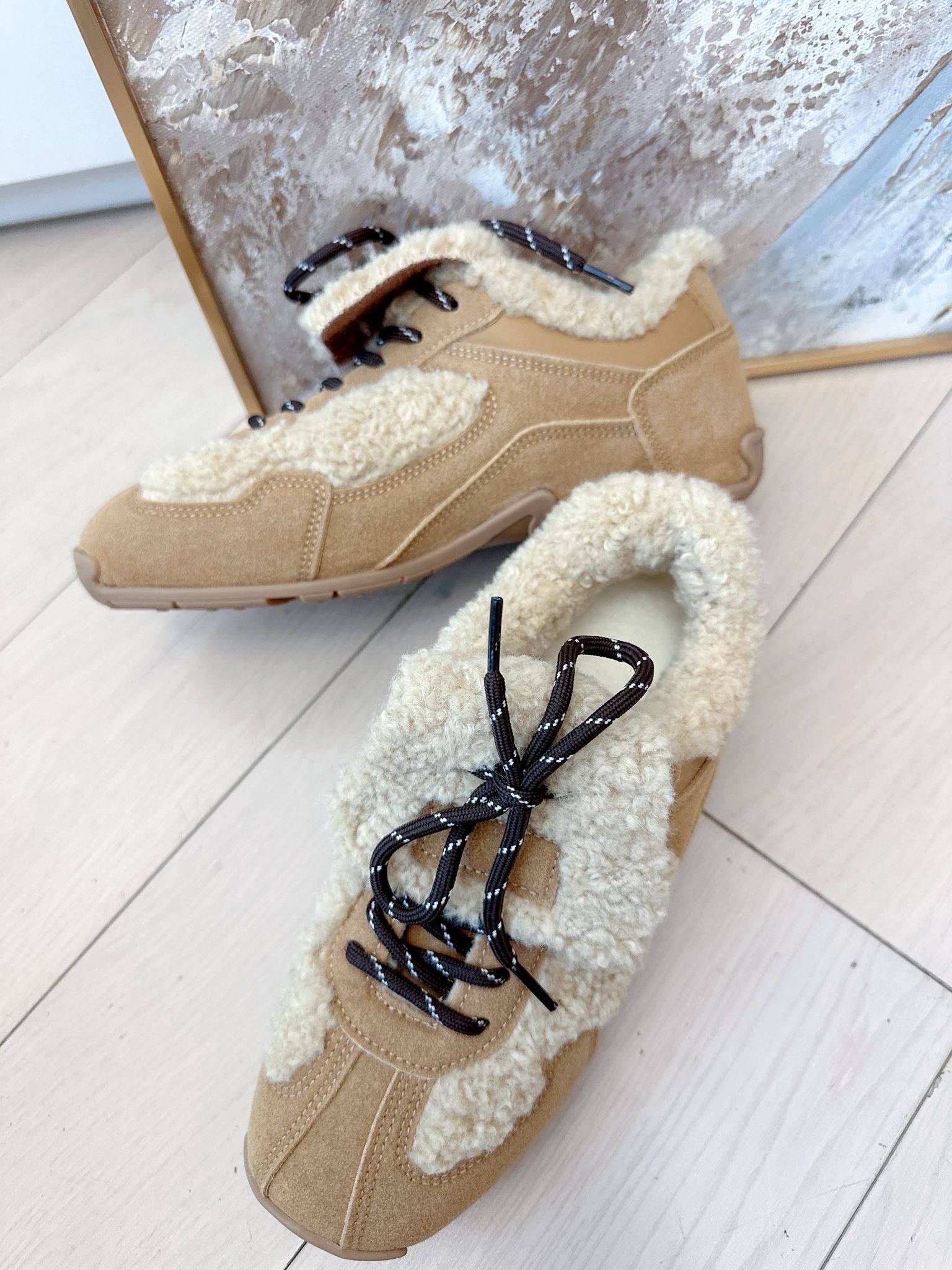 $258對。 韓國✨ ITEM: furry army trainer 👟 ✨ COLOR: camel / brown ✨ DESCRIPTION: 韓國依家都好鬼hit呢一隻trainer / sneaker ~ 話說agent send鞋相俾我睇嘅時候,我點都會搵吓波鞋款,跟住發覺好多鞋鋪都有出呢一種army trainer~ 不過同基本款唔一樣,佢加咗啲可愛嘅girly elements~ 例如contrasting color 嘅鞋帶,再加埋毛毛絨邊~ 即時有心動嘅感覺~ 呢個款有駝色同埋咖啡色~ 我自己覺得駝色襯衫比咖啡色容易,當然,鍾意深色系嘅朋友都可以訂啡色😬 行路百分百舒服~ 成個鞋底都有毛毛,真係好鬼正~ 好似踩緊舊雲咁,軟綿綿🤩 其實我都幾鍾意呢一種鞋帶,感覺有啲點點撞色~ fancy 好多~ ✨ Size :35-40(瘦腳跟正常碼,肉腳買大一碼)