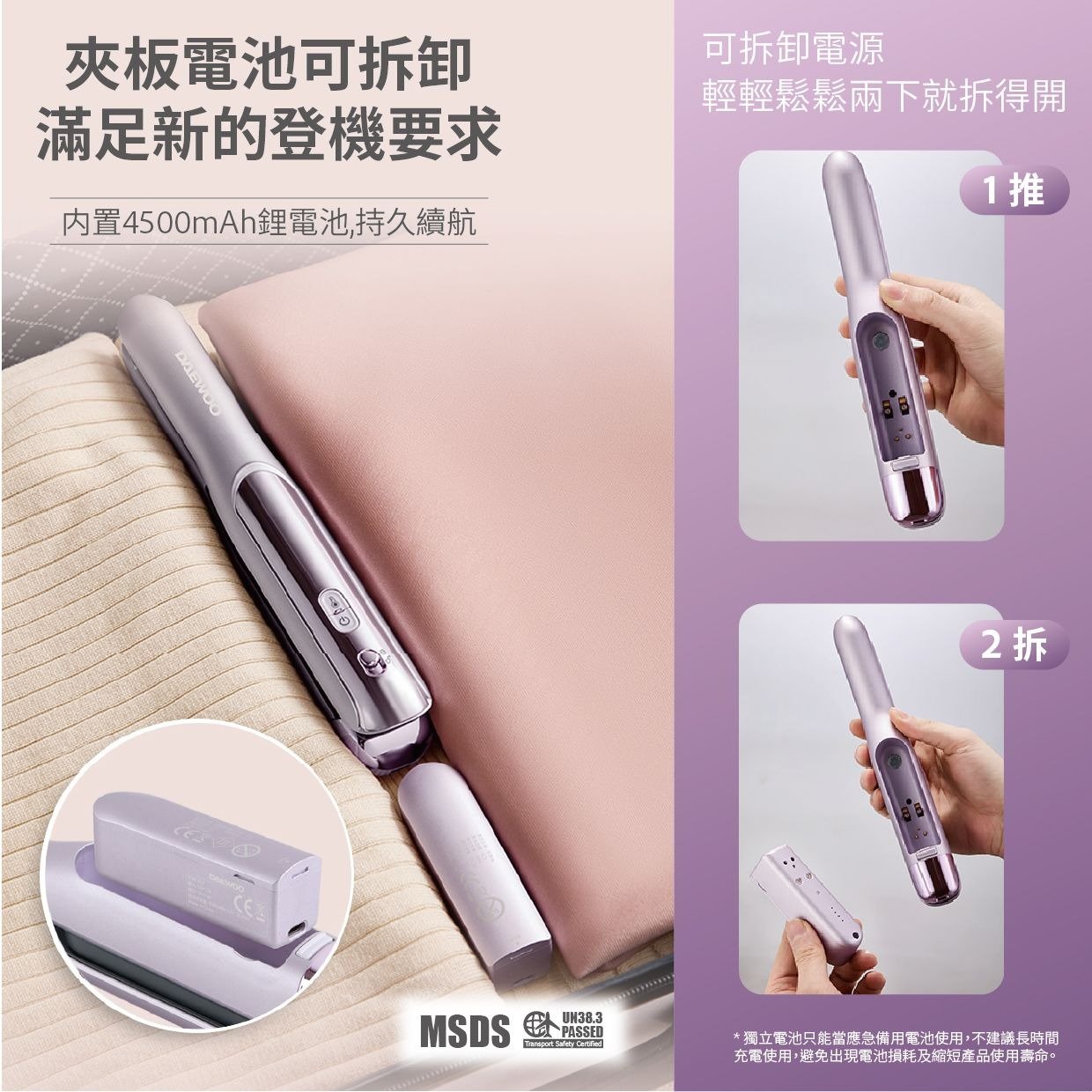 $320, 韓國DAEWOO SC3 無線直髮夾 (可拆電設計 ) 約12月底 韓國DAEWOO SC3 無線直髮夾 (可拆電設計 ) DAEWOO 最新推出SC3 無線直髮夾,可拆電設計 👍🏼 電池備有MSDS 及UN38.3 報告, 符合絕大部分航空公司條例,只需在關機的狀態下就可以將電池取下,輕鬆將電池與機身分離,再放入手提行李。 不需要擔心被沒收的風險,可以安全、放心地隨身攜帶上機。 產品賣點: • 直卷兩用無線直髮夾,小巧便攜 ,一機多用 • 內置4500mAh鋰電池 ,持久續航 • 各種造型都能做,短髮/劉海/髮尾內扣/直髮/ 捲髮 • 快速升溫 造型無需等待 • LED 3檔溫控 ,輕鬆操作 • 陶瓷釉工藝塗層,發熱膜發熱技術 • 一鍵安全鎖扣 ,3分鐘智能斷電 為您的安全保駕護航 • 加大加濶發熱板 一次搞定更多髮量(夾板尺寸約78*20mm) • 圓角弧邊設計 捲髮弧度更自然 • 夾板電池可拆卸,滿足新的登機要求 • 手感安全設計,放低即調至節能狀態(溫度自動降低) • 約240g重量,超輕機身 產品名稱:DAEWOO 無線直髮夾 產品號碼:SC3 顏色:紫色 產品重量:約240g 溫度:160℃/185℃/210℃ 發熱板尺寸:約78mm*20mm 產品尺寸:約24*3.5*4.9cm(L/W/H) 輸入功率:5V 2A 電池容量:3.6V 4500mAh 額定功率:35W 配件:收納包,USB充電線,說明書