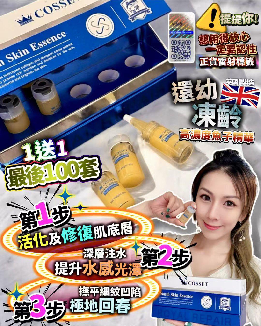 $320套2盒。英國製造 Cosset 還幼凍齡精華(1套2盒) 貨期一星期💕 呢期皮膚好識嘆💕 日日餵食魚子醬😏 想唔滑都幾難‼️ 魔鬼式復仇😈 將肌膚打造成新一代[粉嫩王]❤️ 用放大鏡🔍都睇唔到瑕疵‼️零毛孔‼️ #冬天必備 - 凍齡界代表!滲透而強大!高濃度精華、敏感肌、孕婦無壓力使用!齊齊變靚!買1送1!一盒份量足夠用5-6星期 一套助你由內到外散發光彩✨ - 原來Cosset系列有個【隱藏神品】🌈 #還幼凍齡精華 💧 專門for貴族貴婦選購 平時聽到魚子醬都知係正野!貴野! 而Cosset就選用最奢華最高質深海鱘魚子萃取 再經過專業調配 逆齡抗老效果個個叫讚❤️ 比專櫃品牌更優勝‼️ - 1000盒大貨已抵港💥快買快享‼️半價必搶‼️入冬前必定買佢看住門口😎 凍齡 補濕 膠原增生 緊緻 去紋 收毛孔 「直頭係一應俱全‼️」 皮膚真係滑到咻咻聲~~ - 眾所周知魚子是奢華的食材,除此之外魚子精華擁有的護膚功效,包括緊致去皺、保護滋潤等,其內含多種氨基酸、蛋白質、維他命和礦物質,能為肌膚提供所需的天然復合物,維持肌膚健康和活力🏃🏻♀️➡️ - 🉑記得認清正貨雷射貼先好買購買、帶有不同序號‼️ - 主要核心成分: 🌈二裂酵母💥促進肌膚的修復,還能減少紫外線出現的肌膚老化問題,曬後修復的效果也是非常好的,還能美白肌膚,給肌膚補充營養。 🌈深海鱘魚籽提取精華💥含有前所未有的高濃度魚子萃取物,是美膚駐顏的絕佳珍品。它含有最天然及最有效的抵御老化成分,有助於維持皮膚的青春美態。它能維持及激活皮膚的重要功能,重建皮膚組織及修復受損的皮膚,有效地收緊及挺實疲累和松垂的肌膚,恢復皮膚的漂亮容光。 🌈玻色因、積雪草提取物💥具有消腫的效果,而且它能刺激皮膚深層細胞的更替,讓皮膚能夠更加的光滑有彈性,還能促進真皮層中膠原蛋白的形成防止皮膚水腫 🌈透明質酸鈉💥具有殺菌消炎、美白祛黃的效果,能增強肌膚抵抗力,促進細胞再生,恢復皮膚彈性和緊致。 - 英國製造 8ml*4