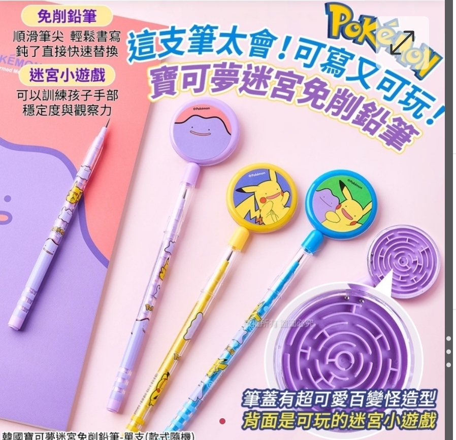 $38套. 2套或以上:$28套. 韓國寶可夢迷宮免削鉛筆 (1套2支) ⛔截單日期:2025/12/11 06:00PM 📦預計貨到日:2月中 🇰🇷✨ 韓國寶可夢迷宮免削鉛筆 這支真的太會!!!😍 可寫、可玩、可愛度爆表 小朋友看到秒瘋狂、大人看到也忍不住想收一支! 首先~它是超方便的 「免削鉛筆」✏️ 完全不用削、不卡卡! 寫久了筆尖鈍掉?👉 只要「拉一下-換一下」立刻補位,超快速、超省事~ 搭配 順滑筆尖,寫字、畫畫都很流暢,抄筆記不怕斷 擦擦寫寫也不會抓到手感,小孩學習更有成就感🌟 再來!!這支筆的靈魂重點來了 —— 🎮 背面竟然是迷宮小遊戲!! 真的太犯規~~~小巧迷你卻超好玩 還能訓練孩子 手部穩定度、觀察力、肌肉控制 讓寫功課或等餐時有個安靜又療癒的小活動💛 而且筆蓋還是 百變怪造型,萌度爆擊! 不管是放在筆袋、書桌、書包裡,看到都會露出姨母笑🤣 寶可夢迷的心直接融化! 一支不到幾十元的價格,卻有 文具+玩具+療癒小物 三重功能✨ 真的 CP 值爆高!讓孩子寫功課也能充滿小確幸~💛✨ -規格︰1套2支 (款式隨機) -產地︰中國 ==⚠️ 聲明 ⚠️== 1.本貨品為平行進口正貨。 2.所有帖文內容只作分享及參考用途。為免混淆視聽,所有商標或版權均屬有關商品品牌商標的持有人,敬請留意。 3.空運/海運有可能因各種不明因素影響而延誤到貨,所有貨品一經訂購後,如非廠家缺貨,不設取消/退貨/換貨。 4.貨品在運輸途中導致產品包裝外盒有任何損毀凹陷,但不影響其產品本身食用/使用,或有機會不預設外盒出貨,我司不會作任何更換或退款。 5.以上資料及外盒包裝只供參考,商品外盒原廠有更換新包裝權利,一切以實物為準。 6.顏色或因拍攝器材或顯示螢幕等因素而與實物有異,以上圖片及文字僅供參考,一切以實物為準。