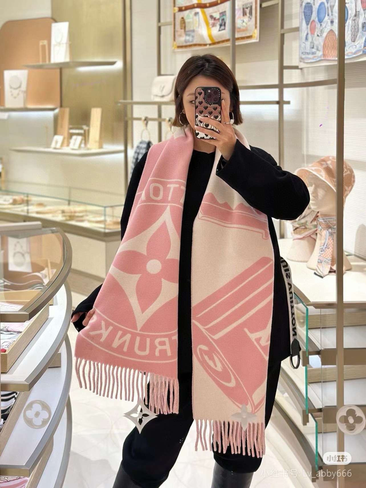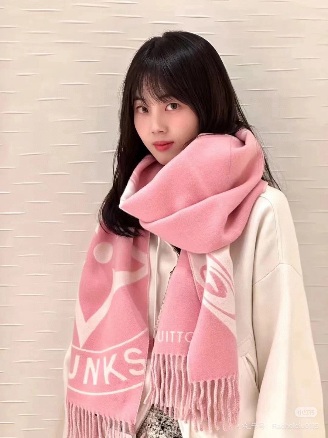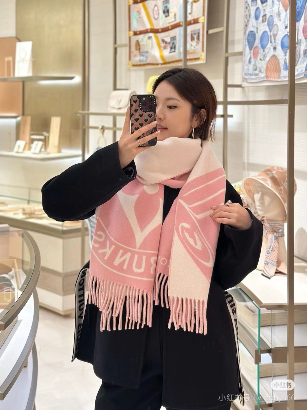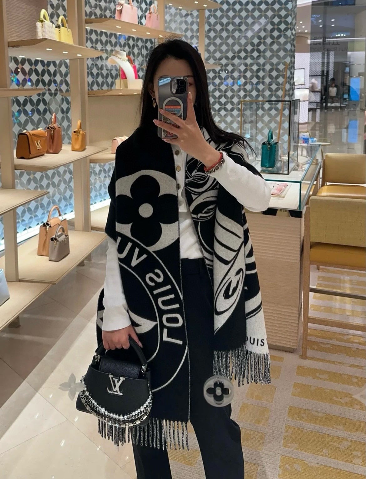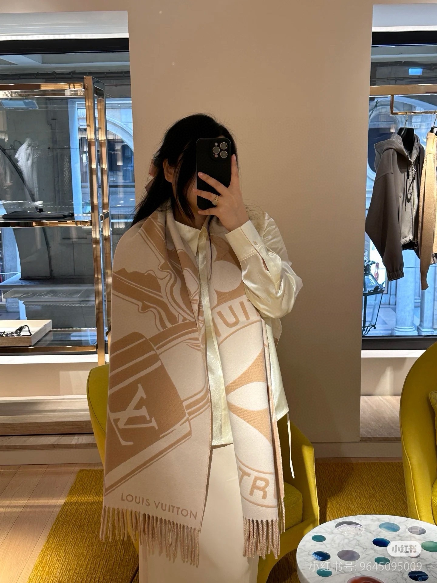 $388條(跟盒)。 Lock And Keys 圍巾|Louis Vuitton 取材自舒暖毛絨感羊毛 × 山羊絨混紡針織, 觸感柔軟溫潤,輕盈卻保暖,佩戴舒適不厚重。 圍巾正面描繪 LV 經典掛鎖與鑰匙圖案, 翻轉背面,則呈現 Louis Vuitton Trunks 圓章設計, 以妙趣而富層次的筆觸, 回溯品牌源自硬箱製作的經典傳承, 細節中盡顯歷史與工藝之美。 鎖匙、硬箱、Monogram 花卉等標誌性元素交織呈現, 低調卻極具辨識度, 為秋冬造型增添一抹不經意的奢華氣息。 --- 📐 尺寸:45 × 215 cm 🧵 材質:60% 綿羊毛|40% 山羊絨 🎨 圖案: ・LV 掛鎖與鑰匙 ・Louis Vuitton 硬箱圓章 ・Monogram 花卉元素 ✨ 設計:雙面圖案設計,流蘇飾邊