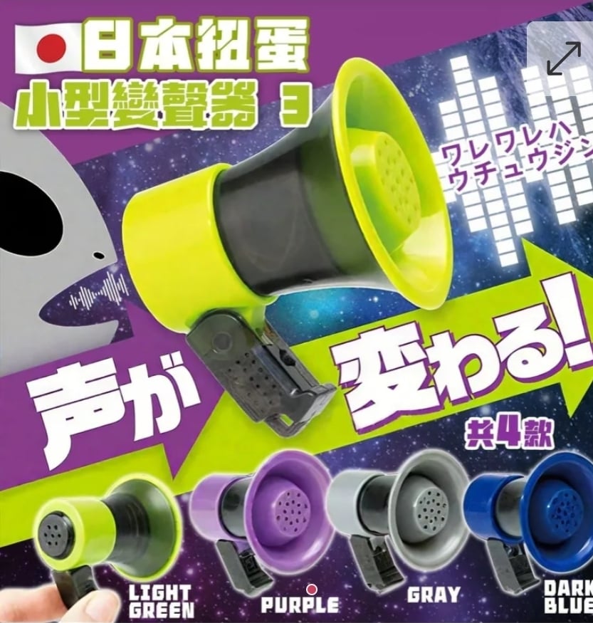$43件. 2件或以上$33件. 日本扭蛋-小型變聲器VOL.3(共4款,隨機出貨) ⛔截單日期:2025/12/22 06:00PM 📦預計貨到日:2026年1月尾 搞鬼必備🤪,超迷妳變聲器📢 唔洗吸氦氣🎈,開聲即刻變身外星人👽 Size細細,🤩仲可以摺疊收納 好在係鮮豔的撞色設計🌈,加埋鐵鍊,😆應該冇咁容易整唔見 仲可以替換鈕扣電池🔋,延續使用壽命 用嚟同朋友、家人交談🎶🎵,畫面諗起都覺得搞笑🤣🤣 ❗注意事項❗ 🔘本產品適合年齡8歲以上。 ▪材質:ABS、鐵 ▪原產地:日本品牌,中國製造 ==⚠️ 聲明 ⚠️== 1.本貨品為平行進口正貨。 2.所有帖文內容只作分享及參考用途。為免混淆視聽,所有商標或版權均屬有關商品品牌商標的持有人,敬請留意。 3.空運/海運有可能因各種不明因素影響而延誤到貨,所有貨品一經訂購後,如非廠家缺貨,不設取消/退貨/換貨。 4.貨品在運輸途中導致產品包裝外盒有任何損毀凹陷,但不影響其產品本身食用/使用,或有機會不預設外盒出貨,我司不會作任何更換或退款。 5.以上資料及外盒包裝只供參考,商品外盒原廠有更換新包裝權利,一切以實物為準。 6.顏色或因拍攝器材或顯示螢幕等因素而與實物有異,以上圖片及文字僅供參考,一切以實物為準。