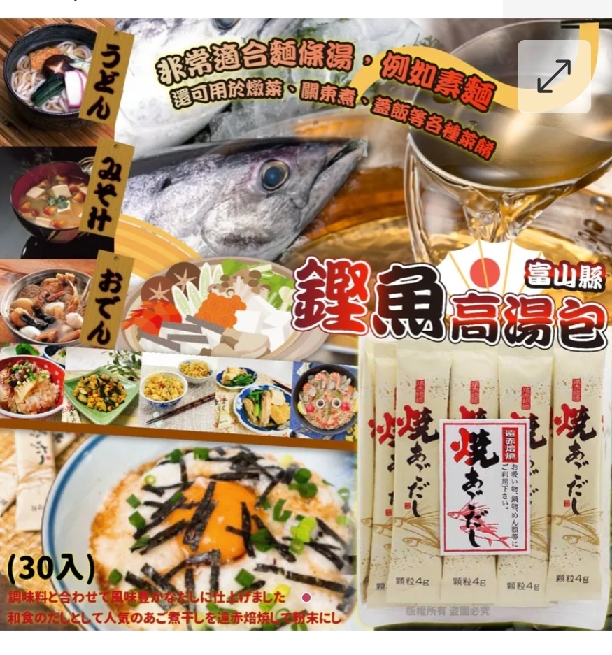 $45包. 2包或以上$35包. 日本製富山縣鏗魚高湯包 (30入) ⛔截單日期:2025/11/27 06:00PM 📦預計貨到日: 2026年1月尾 湯底鮮味首選🤩🤩日本富山必買名產🥇超高評價,🇯🇵鏗魚高湯包 (30入), 低至$/包 ❗ $就整到一碗濃郁高湯🍲 嚴選日本🇯🇵多款食材調配的高湯粉包✨✨ 最特別係用焙燒鏗魚做主湯底, 鮮味十足!! 日本料理中不可或缺的是高湯底,不管是炊飯、關東煮、燉物、粥、火鍋都不能少。 鏗魚鮮香不腥,只有濃濃鰹魚粉、昆布粉、鮮菇粉既香味🤤🤤🤤 煮熟個「烏冬」好容易 🏻,但要複製「湯底」呢個精髓 ......都唔係好難姐 有呢包就掂啦,一包夠30次用啦 低至$1/次~好鮮甜又好方便^^ 🔸無添加物,無化學合成物,食用更安心 🔸獨立包裝,輕易保存、不怕受潮 💮遵循日本職人傳統秘技黃金比例,研磨、調配而成的高湯粉包。 💪🏻無論拎嚟💪🏻 ✨煮麵、蒸蛋、煮飯 ✨炒餸、熬湯、火鍋 💪🏻全部都得,有益又健康💪🏻 呢款湯底包係日本成日賣斷貨㗎🔥超人氣品牌,好多日本餐廳都用佢黎做湯底㗎‼ 一小包就已經係3-4人份 (可依各人口味調整)。而家買一大包翻去慢慢用都得吖👍🏻超簡單用法,只要加一碗水及一包鏗魚湯底熬煮,即可做成濃郁高湯🤤 ▪產地:日本 ▪規格:4g x 30小包 ▪食用期:出廠日計720天 ==⚠️ 聲明 ⚠️== 1.本貨品為平行進口正貨。 2.所有帖文內容只作分享及參考用途。為免混淆視聽,所有商標或版權均屬有關商品品牌商標的持有人,敬請留意。 3.空運/海運有可能因各種不明因素影響而延誤到貨,所有貨品一經訂購後,如非廠家缺貨,不設取消/退貨/換貨。 4.貨品在運輸途中導致產品包裝外盒有任何損毀凹陷,但不影響其產品本身食用/使用,或有機會不預設外盒出貨,我司不會作任何更換或退款。 5.以上資料及外盒包裝只供參考,商品外盒原廠有更換新包裝權利,一切以實物為準。 6.顏色或因拍攝器材或顯示螢幕等因素而與實物有異,以上圖片及文字僅供參考,一切以實物為準。