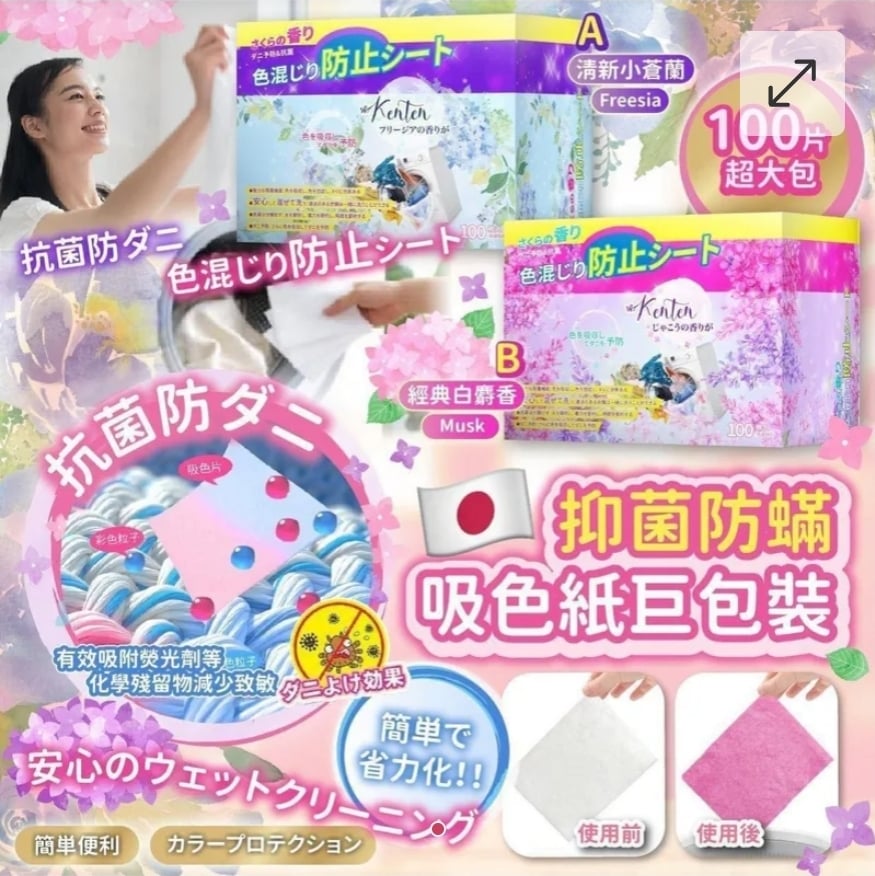 $45包. 2包或以上每包$35包. 抑菌防蟎吸色紙巨量裝(一包100片) ⛔截單日期:2025/12/24 06:00PM 📦預計貨到日: 2月頭 A)清新小蒼蘭 Freesia B)經典白麝香 Musk ⭐‼️‼️超大包⭐1包100片🤩 季節限定香氣⭐勁量裝⭐適用於各類衣物💪🏻 防止白色衣物變黃✔️保持深色衣物顏色✔️ 防止淺色衣物染色串✔️抗菌抑蟎📌防止染色📌 可深淺色衣物同時混洗💪🏻 可吸附熒光劑等化學殘留物減少致敏💪🏻 洗衣物時放入可吸走有色分子,防止染色💪🏻 ✴️防止白色衣物變黃 ✴️保持深色衣物顏色 ✴️防止淺色衣物染色串色 -用量︰ 30L 洗衣機 / 淺色衣物︰2片 40L 洗衣機 / 中性色衣物︰3片 50L 或以上洗衣機 / 深色衣物︰5-6片 -使用方法︰抽取適當片數,放入洗衣機與衣物一起洗,洗完後棄置. -規格︰1包100片 ==⚠️ 聲明 ⚠️== 1.本貨品為平行進口正貨。 2.所有帖文內容只作分享及參考用途。為免混淆視聽,所有商標或版權均屬有關商品品牌商標的持有人,敬請留意。 3.空運/海運有可能因各種不明因素影響而延誤到貨,所有貨品一經訂購後,如非廠家缺貨,不設取消/退貨/換貨。 4.貨品在運輸途中導致產品包裝外盒有任何損毀凹陷,但不影響其產品本身食用/使用,或有機會不預設外盒出貨,我司不會作任何更換或退款。 5.以上資料及外盒包裝只供參考,商品外盒原廠有更換新包裝權利,一切以實物為準。 6.顏色或因拍攝器材或顯示螢幕等因素而與實物有異,以上圖片及文字僅供參考,一切以實物為準。