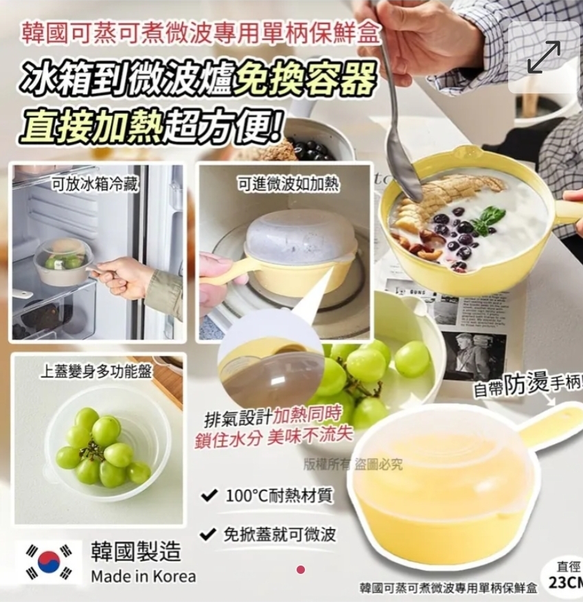 $45套2個。 2套起$35套。 韓國可蒸可煮微波專用單柄保鮮盒23cm(1套2個) ⛔截單日期:2025/10/30 06:00PM 📦預計貨到日: 12月尾 #買一送一 韓國可蒸可煮微波專用單柄保鮮盒23cm 規格:23cm/黃色 ✨韓國微波專用單柄保鮮盒✨ 你的廚房好幫手來啦!😍 這款超實用的保鮮盒,不僅可以放進微波爐加熱 還能直接放冰箱冷藏,超方便!💯 ✔耐冷耐熱:-20℃~100℃ ✔單手操作:有手柄設計,拿取超輕鬆 ✔蒸氣孔設計:加熱不溢出,效果更均勻 ✔多功能蓋子:深度夠深~可當盤子 ✔堆疊收納:節省空間又整齊 最讓人驚喜的是,手柄部分完全不會變熱🔥 再也不用擔心燙到手啦!而且蓋子還能向內折疊,清潔起來毫不費力~ 尺寸剛剛好(23公分),無論是裝飯菜還是小點心都超適合!🎉 快來體驗這個韓國製造的高品質神器吧~💖 *韓國製造 ==⚠️ 聲明 ⚠️== 1.本貨品為平行進口正貨。 2.所有帖文內容只作分享及參考用途。為免混淆視聽,所有商標或版權均屬有關商品品牌商標的持有人,敬請留意。 3.空運/海運有可能因各種不明因素影響而延誤到貨,所有貨品一經訂購後,如非廠家缺貨,不設取消/退貨/換貨。 4.貨品在運輸途中導致產品包裝外盒有任何損毀凹陷,但不影響其產品本身食用/使用,或有機會不預設外盒出貨,我司不會作任何更換或退款。 5.以上資料及外盒包裝只供參考,商品外盒原廠有更換新包裝權利,一切以實物為準。 6.顏色或因拍攝器材或顯示螢幕等因素而與實物有異,以上圖片及文字僅供參考,一切以實物為準。