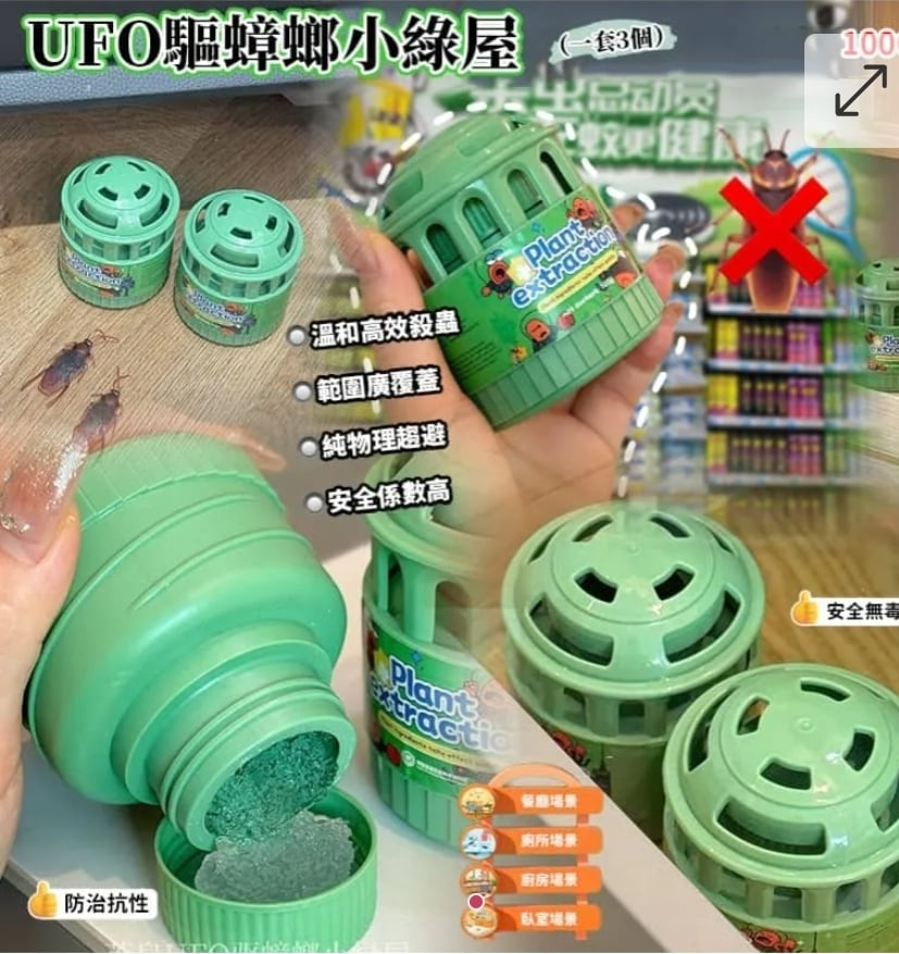 $45套3個。 2套或以上:$35套. UFO 驅蟑螂小綠屋 100g (1套3個) ⛔截單日期:2025/11/17 06:00PM 📦預計貨到日: 2026年1月頭 蟑螂終結者🤙大小通殺💥 連鎖滅殺端掉一窩🤣 天然植物提取物,無毒無刺激 放好後藥效持久,無需頻繁施藥 市面上最科學安全的殺蟑武器之一 家裡有小孩和寵物的也可以放心用❗ ▪植物提取全屋可用 ▪用它滅掉小強最後的倔強 開蓋使用!可以在蟑螂經常出沒的區域放置一盒我們的小綠屋 它選取驅避蟑螂的植物精油成分讓蟑螂不敢靠近從而驅走蟑螂24小時不間斷強效驅蟑!! -規格:1套3個,每個100g ==⚠️ 聲明 ⚠️== 1.本貨品為平行進口正貨。 2.所有帖文內容只作分享及參考用途。為免混淆視聽,所有商標或版權均屬有關商品品牌商標的持有人,敬請留意。 3.空運/海運有可能因各種不明因素影響而延誤到貨,所有貨品一經訂購後,如非廠家缺貨,不設取消/退貨/換貨。 4.貨品在運輸途中導致產品包裝外盒有任何損毀凹陷,但不影響其產品本身食用/使用,或有機會不預設外盒出貨,我司不會作任何更換或退款。 5.以上資料及外盒包裝只供參考,商品外盒原廠有更換新包裝權利,一切以實物為準。 6.顏色或因拍攝器材或顯示螢幕等因素而與實物有異,以上圖片及文字僅供參考,一切以實物為準。