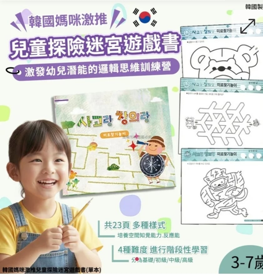 $45本. 2本或以上:$35本. 韓國兒童探險迷宮遊戲書 (1本23頁) ⛔截單日期:2025/12/28 06:00PM 📦預計貨到日: 3月頭 📢 爸媽快看!讓孩子放下平板神器來了!🤩 🧠 專注力UP! 多變的可愛動物🐘、幾何❄️ 迷宮設計 訓練孩子的手眼協調和空間感,讓專注力直線飆升!📈 分為基礎/初級/中級/高級4 種 可以進行階段性學習📈 創造力爆發! 黑白線稿設計,不只是走迷宮 還是有趣的著色畫!🖍️ 一本書滿足邏輯與藝術雙重需求! 探險超有趣! 跟著可愛探險家角色 讓孩子把動腦變成一場尋寶大冒險!🏆 告別無聊,成就感滿滿! -規格:1本23頁 -尺寸:22.5cm x 20cm -產地:韓國 ==⚠️ 聲明 ⚠️== 1.本貨品為平行進口正貨。 2.所有帖文內容只作分享及參考用途。為免混淆視聽,所有商標或版權均屬有關商品品牌商標的持有人,敬請留意。 3.空運/海運有可能因各種不明因素影響而延誤到貨,所有貨品一經訂購後,如非廠家缺貨,不設取消/退貨/換貨。 4.貨品在運輸途中導致產品包裝外盒有任何損毀凹陷,但不影響其產品本身食用/使用,或有機會不預設外盒出貨,我司不會作任何更換或退款。 5.以上資料及外盒包裝只供參考,商品外盒原廠有更換新包裝權利,一切以實物為準。 6.顏色或因拍攝器材或顯示螢幕等因素而與實物有異,以上圖片及文字僅供參考,一切以實物為準。