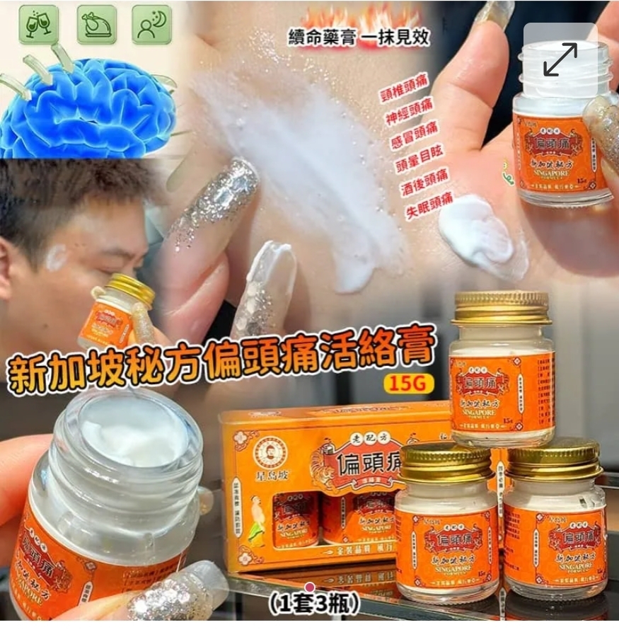 $45盒3樽。 2盒或以上:$35盒。 新加坡秘方偏頭痛活絡膏 (1盒3樽) ⛔截單日期:2025/11/25 06:00PM 📦預計貨到日:2026年1月中 新加坡傳承配方💥專治頭部不適疼! 集通絡+舒緩+修復於一體✅多種中草濃縮,功效超強! 萃取草本精華,一抹就能深層滲透!純天然配方,安全不刺激! 張力失衡引起的偏頭痛、緊張性頭痛、頸椎性頭痛、鼻炎等引起的頭痛都有效! 小分子精粹,能讓有效成分透皮透骨吸收 平衡腦內壓力,通絡止痛、疏風活血 快速🔜減輕各種原因引起的頭暈頭痛 超濃縮配方,一樽抵普通3樽! ❸分鐘快速🔜緩解疼痛! 只要輕輕塗抹在太陽穴處,24小時持續緩解頭部不適,效果好到爆炸! -規格:1盒3樽,每樽15g -主要成分:毒蠍 蜈蚣 冬青油 紅景天 生川烏 黑螞蟻 肉桂油 薄荷油 樟腦油 丁香油 桉葉油 凡士林 等 ==⚠️ 聲明 ⚠️== 1.本貨品為平行進口正貨。 2.所有帖文內容只作分享及參考用途。為免混淆視聽,所有商標或版權均屬有關商品品牌商標的持有人,敬請留意。 3.空運/海運有可能因各種不明因素影響而延誤到貨,所有貨品一經訂購後,如非廠家缺貨,不設取消/退貨/換貨。 4.貨品在運輸途中導致產品包裝外盒有任何損毀凹陷,但不影響其產品本身食用/使用,或有機會不預設外盒出貨,我司不會作任何更換或退款。 5.以上資料及外盒包裝只供參考,商品外盒原廠有更換新包裝權利,一切以實物為準。 6.顏色或因拍攝器材或顯示螢幕等因素而與實物有異,以上圖片及文字僅供參考,一切以實物為準。