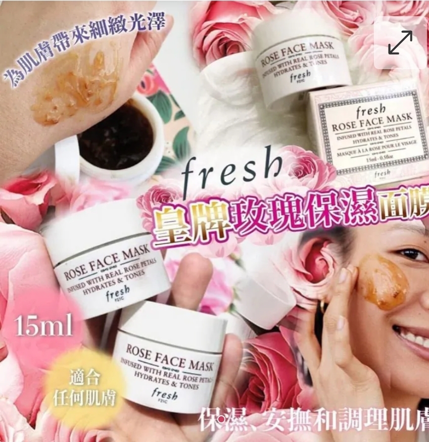 $48個. 2個或以上每個$38個. FRESH ROSE FACE MASK玫瑰保濕面膜(15ml) ⛔截單日期:2025/12/23 06:00PM 📦預計貨到日:2026年1月中 品牌皇牌💖🥇$580/100ml ❌專櫃 $2xx/30ml❌ 🌟ROSE FACE MASK 玫瑰保濕面膜為肌膚保濕,調節膚色,讓肌膚回復柔潤光澤 🌟獨特的水潤啫喱配方注入了純正玫瑰花瓣,能輕易溶於肌膚 ✅純淨玫瑰水可舒緩肌膚、調節膚色 ✅青瓜萃取及蘆薈啫喱有助舒緩肌膚,瞬間帶來清涼及鎮靜功效 ✅「智慧型」深水海藻成分提供極致保濕,令肌膚水分提升至最佳狀態 ✅蘊含豐富抗氧化物的綠茶可亮化及保護肌膚 🔹合適膚質:所有肌膚 🔸使用說明:塗於清潔及濕潤的肌膚上,避免接觸眼部範圍。敷上約5-10分鐘後,以溫水洗淨。可每天使用。 規格:15ml 產地:法國 Exp:2027/05或之後 ==⚠️ 聲明 ⚠️== 1.本貨品為平行進口正貨。 2.所有帖文內容只作分享及參考用途。為免混淆視聽,所有商標或版權均屬有關商品品牌商標的持有人,敬請留意。 3.空運/海運有可能因各種不明因素影響而延誤到貨,所有貨品一經訂購後,如非廠家缺貨,不設取消/退貨/換貨。 4.貨品在運輸途中導致產品包裝外盒有任何損毀凹陷,但不影響其產品本身食用/使用,或有機會不預設外盒出貨,我司不會作任何更換或退款。 5.以上資料及外盒包裝只供參考,商品外盒原廠有更換新包裝權利,一切以實物為準。 6.顏色或因拍攝器材或顯示螢幕等因素而與實物有異,以上圖片及文字僅供參考,一切以實物為準。