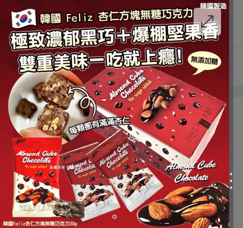 $48套5包。2套起$38套,韓國Feliz杏仁方塊無糖巧克力30g(1套5包)