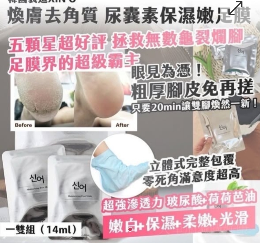 $48套5包。 2套起$38套。 韓國尿囊素精華煥膚足膜一雙14ml(1套5包) ⛔截單日期:2025/11/25 06:00PM 📦預計貨到日: 2026年1月中 一起為☀夏天的腳做準備吧~ 為了露出美美的腳🦶✨ 不用到外面做貴貴的SPA啦🧐🧐 闆娘都在用的💓"韓國尿囊素精華煥膚足膜" 👀特別添加尿囊素、乳木果油、酪梨油、金盞花 ✔溶解角質 ✔修復乾裂 ✔長效滋潤 免搓免刮、不掉屑!一天20分鐘💦乾裂腳丫OUT 也能為上班一天的腳舒緩放鬆呢~😍😍 *韓國製造 1.將腳洗乾淨後,徹底去除水分。 2. 取出足膜,根據虛線將兩側分開後,像穿襪子一樣戴在兩腳上。 3. 休息約20~30分鐘後摘除足膜,剩餘內容物 輕輕拍打幫助產品吸收。 ★規格:14ml ==⚠️ 聲明 ⚠️== 1.本貨品為平行進口正貨。 2.所有帖文內容只作分享及參考用途。為免混淆視聽,所有商標或版權均屬有關商品品牌商標的持有人,敬請留意。 3.空運/海運有可能因各種不明因素影響而延誤到貨,所有貨品一經訂購後,如非廠家缺貨,不設取消/退貨/換貨。 4.貨品在運輸途中導致產品包裝外盒有任何損毀凹陷,但不影響其產品本身食用/使用,或有機會不預設外盒出貨,我司不會作任何更換或退款。 5.以上資料及外盒包裝只供參考,商品外盒原廠有更換新包裝權利,一切以實物為準。 6.顏色或因拍攝器材或顯示螢幕等因素而與實物有異,以上圖片及文字僅供參考,一切以實物為準。