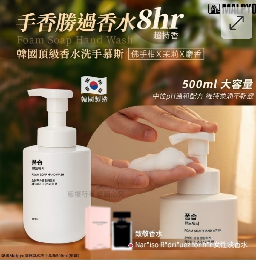 $48支 . 2支起$38支. 韓國Malpyo頂級香水洗手慕斯500ml ⛔截單日期:2025/10/30 06:00PM 📦預計貨到日: 12月尾 ✨ 讓日常清潔升級為一場奢寵護理儀式 這款慕斯不只是洗手液,更是您對精緻生活細節的追求 我們堅持採用每日高級護理標準,讓雙手隨時保持在最佳狀態 🥥 泡沫如絲綢般柔滑細膩,源自椰子油精華 能深入指尖與肌膚紋理,溫和且徹底地洗淨髒污 讓您告別一般洗手液的乾燥粗糙感 💧 專為亞洲肌膚設計,採用溫和中性 pH 配方 有效降低清潔過程對皮膚的刺激 接觸肌膚的瞬間即注入水潤保濕,洗後雙手水潤不緊繃 就像剛擦完護手霜一樣舒適 👃🏻 奢華調香師級香氣,是 Malpyo 的靈魂所在 為您的每次洗手留下一個高級且持久的印記 🌿 前調: 清新透明的柑橘與綠色草本香,為您開啟美好的一天 🌸 中調: 茉莉、紫羅蘭的優雅花香,釋放專屬於女性的柔美與精緻 💧 基調: 以溫暖的麝香、琥珀、檀香收尾,交織出深邃迷人的餘韻,久久縈繞不散。 💖 從清晨到夜晚,每一次的輕柔搓洗 都是一次療癒身心的嗅覺旅程~不再只是被動清潔 而是主動享受這份頂級的呵護 *韓國製造 ==⚠️ 聲明 ⚠️== 1.本貨品為平行進口正貨。 2.所有帖文內容只作分享及參考用途。為免混淆視聽,所有商標或版權均屬有關商品品牌商標的持有人,敬請留意。 3.空運/海運有可能因各種不明因素影響而延誤到貨,所有貨品一經訂購後,如非廠家缺貨,不設取消/退貨/換貨。 4.貨品在運輸途中導致產品包裝外盒有任何損毀凹陷,但不影響其產品本身食用/使用,或有機會不預設外盒出貨,我司不會作任何更換或退款。
