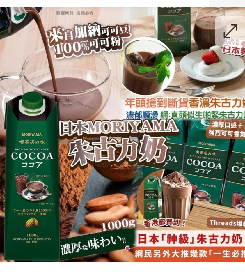 $48枝. 2枝或以上$38枝 日本製MORIYAMA朱古力奶1L ⛔截單日期:2025/12/21 06:00PM 📦預計貨到日: 2月中 😍終於回歸啦~~Threads流量密碼🗝️ 突然爆紅💣MORIYAMA守山乳業🍫可可朱古力奶🥛 我地之前開團大賣❤️🔥❤️🔥依家再encore📢直送家中唔洗周圍頻頻撲撲😎 有冇朋友同小編一樣🙋🏻♀️,一到冬天☃️就想飲濃厚的朱古力奶🤤👏🏻MORIYAMA守山乳業呢款🍫可可朱古力奶🥛喺小編冬日存糧之一 嚴選100%優質👨🏻🍳迦納純可可粉➕新鮮順滑口感的濃厚生乳🐮 以⚖️高比例配方碰撞出💥coffee shop獨有的香滑濃郁滿足😋 小編最鍾意嚟做特飲🤩,一打開就喺濃濃的朱古力奶香👃🏻 尤其喺雪凍後❄️,簡單再加🥛牛奶 & 冰塊🧊,頂頭擠D cream🍦,正爆😝 整熱飲都得♨️,倒入咖啡又有另一番風味☕️ 🏃🏻♀️唔講咁多,即刻📱買多幾枝團貨啦📦📦📦 ⚠️本產品含牛奶,過敏者慎用⚠️ ▪️淨重量:1000g ▪️原產地:日本製造 ▪️有效期:出廠日計180天-270天️ ▪️保存方法:在室溫下保存,避免陽光直射、高溫、潮濕的地方。 開封後請存放於冰箱(10℃以下)並儘快使用。 ==⚠️ 聲明 ⚠️== 1.本貨品為平行進口正貨。 2.所有帖文內容只作分享及參考用途。為免混淆視聽,所有商標或版權均屬有關商品品牌商標的持有人,敬請留意。 3.空運/海運有可能因各種不明因素影響而延誤到貨,所有貨品一經訂購後,如非廠家缺貨,不設取消/退貨/換貨。 4.貨品在運輸途中導致產品包裝外盒有任何損毀凹陷,但不影響其產品本身食用/使用,或有機會不預設外盒出貨,我司不會作任何更換或退款。 5.以上資料及外盒包裝只供參考,商品外盒原廠有更換新包裝權利,一切以實物為準。 6.顏色或因拍攝器材或顯示螢幕等因素而與實物有異,以上圖片及文字僅供參考,一切以實物為準。
