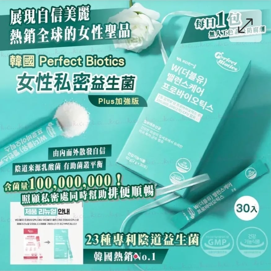 $48盒. 2盒或以上$38盒. 韓國 Perfect Biotics 女性私密益生菌加強版30入 ⛔截單日期:2025/11/03 06:00PM 📦預計貨到日:2026年1月中 對於陰道的保養較容易忽略😵 但這女生是必備的營養素~😉 闆娘特別推薦這款益生菌‼️ 聽說在韓國特別火紅💕 是由女性私密處,萃取的健康益生菌 ✅超高達100,000,000的含菌量 ✅3種獲得專利陰道衍生乳酸菌 ✅泡菜乳酸菌 ✅19種優質益生菌 這些益生菌~可以抑制有害益菌種繁殖💪 😇不僅照顧您私密處還能幫助更順暢排便噢🫶 女生私密處健康~更能展現自信美麗😎 食用方式:每天一包(不限年紀食用) ⚠️若譯過敏或特殊體質請勿食用⚠️ -產地:韓國 -規格:2g*30包/盒 -保存期限:2027年01月10日(商品銷售速度快,依實際出廠為主。) -保存方式:避免陽光直射,請置於陰涼乾燥。 -注意事項: ※請確保將產品放在孩童和寵物接觸不到的地方。 ※使用後如有不適,請暫停使用並諮詢專業醫師。 =⚠️ 聲明 ⚠️== 1.本貨品為平行進口正貨。 2.所有帖文內容只作分享及參考用途。為免混淆視聽,所有商標或版權均屬有關商品品牌商標的持有人,敬請留意。 3.空運/海運有可能因各種不明因素影響而延誤到貨,所有貨品一經訂購後,如非廠家缺貨,不設取消/退貨/換貨。 4.貨品在運輸途中導致產品包裝外盒有任何損毀凹陷,但不影響其產品本身食用/使用,或有機會不預設外盒出貨,我司不會作任何更換或退款。 5.以上資料及外盒包裝只供參考,商品外盒原廠有更換新包裝權利,一切以實物為準。 6.顏色或因拍攝器材或顯示螢幕等因素而與實物有異,以上圖片及文字僅供參考,一切以實物為準。