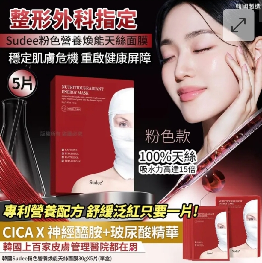 $48盒. 2盒起$38盒 . 韓國Sudee粉色營養煥能天絲面膜30gX5片(單盒) ⛔截單日期:2025/11/17 06:00PM 📦預計貨到日: 2026年1月中 熬夜追劇臉垮掉?換季敏感肌爆發?痘痘紅血絲亂入? 別擔心!韓國Sudee粉色營養煥能天絲面膜來拯救你的臉啦~💖 這款面膜可是韓國整容專家品牌推出的「繃帶面膜」 聽起來就很硬派對吧?但其實超溫柔,PH值5.7弱酸性 讓你的肌膚回到最自然的狀態,像剛睡飽8小時一樣嫩嫩的!✨ 膜布採用100%TENCEL PLAIN材質,比普通膜布吸水力強15倍! 敷上去就像給臉穿了一件超高級的水衣,纖薄透氣又服貼 還完全不含防腐劑,敏感肌、熟齡肌都能安心使用!💦 重點來了,這片面膜裡還有馬齒莧萃取物和蜂膠成分 簡直是肌膚界的營養補品!它能舒緩修復、改善紅血絲和痘痘 讓你的臉秒變健康光滑,連換季乾燥都不怕~💪 只需一片,肌膚恢復元氣,保濕屏障建立完成! 敷完直接拍照上傳,保證朋友都問你:「欸你最近皮膚怎麼這麼好?」😏 快來試試這款粉紅繃帶面膜吧~你的肌膚會感謝你💖 *韓國製造 ==⚠️ 聲明 ⚠️== 1.本貨品為平行進口正貨。 2.所有帖文內容只作分享及參考用途。為免混淆視聽,所有商標或版權均屬有關商品品牌商標的持有人,敬請留意。 3.空運/海運有可能因各種不明因素影響而延誤到貨,所有貨品一經訂購後,如非廠家缺貨,不設取消/退貨/換貨。 4.貨品在運輸途中導致產品包裝外盒有任何損毀凹陷,但不影響其產品本身食用/使用,或有機會不預設外盒出貨,我司不會作任何更換或退款。 5.以上資料及外盒包裝只供參考,商品外盒原廠有更換新包裝權利,一切以實物為準。 6.顏色或因拍攝器材或顯示螢幕等因素而與實物有異,以上圖片及文字僅供參考,一切以實物為準。