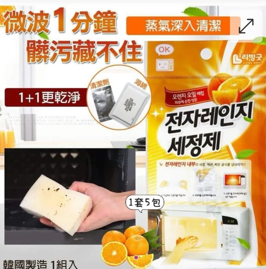 $49套5件。 2套或以上:$39套。 韓國 LIVING GOOD 微波爐專用清潔劑 (1套5包) ⛔截單日期:2025/12/15 06:00PM 📦預計貨到日: 2月中 🇰🇷韓國熱銷款🏆 韓國製自然柑橘🍊 環保又輕鬆,殺菌、除臭、清潔一次搞定😮 可徹底清潔整個微波爐✨ 採用自然橘子🍊精油原料 不傷肌膚 去油效果一流👍🏻深入各類油脂迅速充分溶解油污 遇熱都不會揮發有害物質 同時帶來柑橘清香💖 真的是各位煮婦煮夫不能錯過既清潔神物喔!!!😍 🚨使用方法🚨 1.將海綿放置於微波爐轉盤上方 2.再加入柑橘清潔劑倒在海綿上面 3.使用一般烹調設定一分鐘,加熱過程柑橘香會同時將微波爐除臭 4.時間到後打開,建議帶個塑膠手套,剛開始海綿有一點熱,接下來就可以用海綿將微波爐整個內部刷一刷,你會看到好多油垢髒污都刷出來了 5.最後用濕抹布擦乾淨即可💪💪 ※貼心提醒:各式烤箱、水波爐也可以使用 ==⚠️ 聲明 ⚠️== 1.本貨品為平行進口正貨。 2.所有帖文內容只作分享及參考用途。為免混淆視聽,所有商標或版權均屬有關商品品牌商標的持有人,敬請留意。 3.空運/海運有可能因各種不明因素影響而延誤到貨,所有貨品一經訂購後,如非廠家缺貨,不設取消/退貨/換貨。 4.貨品在運輸途中導致產品包裝外盒有任何損毀凹陷,但不影響其產品本身食用/使用,或有機會不預設外盒出貨,我司不會作任何更換或退款。 5.以上資料及外盒包裝只供參考,商品外盒原廠有更換新包裝權利,一切以實物為準。 6.顏色或因拍攝器材或顯示螢幕等因素而與實物有異,以上圖片及文字僅供參考,一切以實物為準。