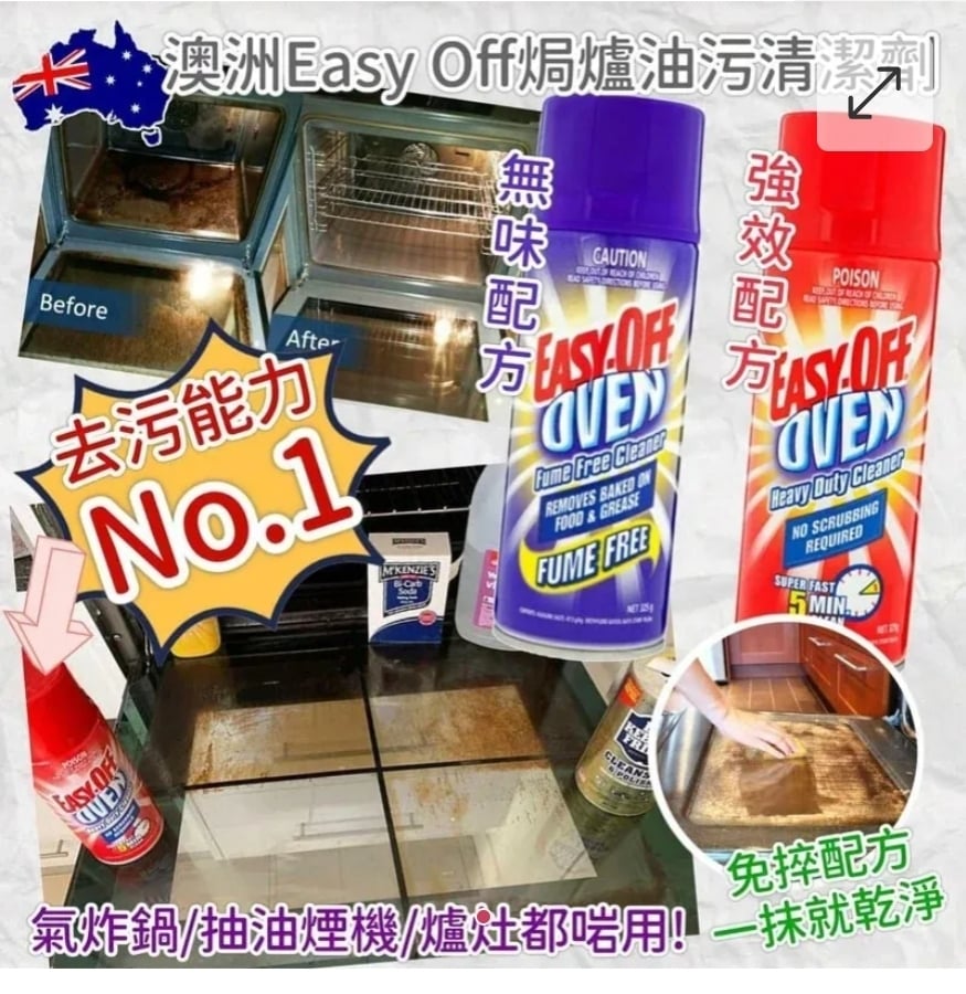 $52支. 2支或以上:$42支. 澳洲 Easy Off 焗爐油污清潔劑 325g ⛔截單日期:2025/12/17 06:00PM 📦預計貨到日:3月頭 A.紫色無味配方 B.紅色強效配方 好多朋友都有用氣炸鍋,不知不覺就積左好多黑黑嘅油漬, 但係又唔省得,唔知點搞🤔🤔 呢款Easy Off焗爐油污清潔劑可以用係氣炸鍋、抽油煙機、爐灶或者焗爐,超好用!!! 呢隻Easy Off焗爐油污清潔劑經過澳洲生活雜誌測試,證實去油去污效力No.1🏆🏆 清潔油污毫不費力!!睇相就知佢有幾勁💪🏻💪🏻💪🏻 除咗焗爐之外,抽油煙機夾層或者爐灶都有啲細小洞洞或罅隙難於清潔嘅位置都難唔到Easy Off,用咗佢就所有窿窿罅罅都乾淨哂~ 最重要係Easy Off焗爐油污清潔劑唔會殘留異味,唔洗怕清潔完焗蛋糕曲奇都有陣怪味👍🏻👍🏻 ✨可以快速清潔頑固污漬,唔洗費時費力係咁捽 ✨深層清潔烤箱、烤架去除頑固油脂和燒焦食物 ✨完全不釋放腐蝕性煙霧,乾淨無殘留異味 ✨特別配方,只需5分鐘即可快速清潔強烈污漬 只要簡單噴上Easy-Off,然後等待它消除頑固的污漬,5分鐘後用乾淨抹布擦乾淨就可以✨✨👍 -規格:325g =⚠️ 聲明 ⚠️== 1.本貨品為平行進口正貨。 2.所有帖文內容只作分享及參考用途。為免混淆視聽,所有商標或版權均屬有關商品品牌商標的持有人,敬請留意。 3.空運/海運有可能因各種不明因素影響而延誤到貨,所有貨品一經訂購後,如非廠家缺貨,不設取消/退貨/換貨。 4.貨品在運輸途中導致產品包裝外盒有任何損毀凹陷,但不影響其產品本身食用/使用,或有機會不預設外盒出貨,我司不會作任何更換或退款。 5.以上資料及外盒包裝只供參考,商品外盒原廠有更換新包裝權利,一切以實物為準。 6.顏色或因拍攝器材或顯示螢幕等因素而與實物有異,以上圖片及文字僅供參考,一切以實物為準。