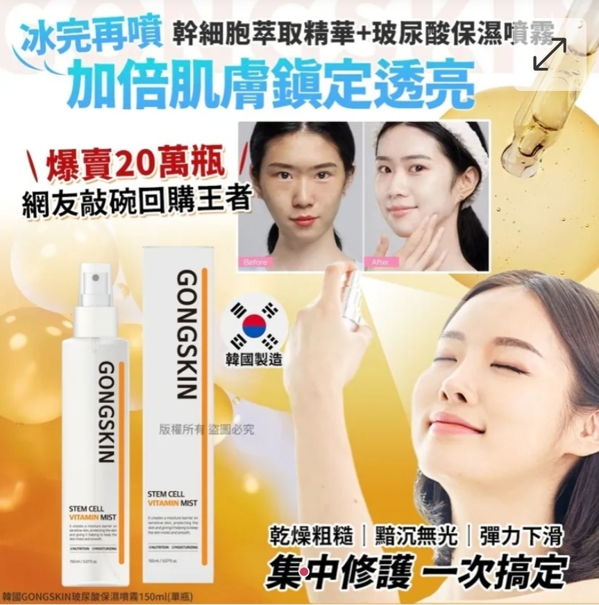 $55套2支。 2套起$45套 韓國GONGSKIN玻尿酸保濕噴霧150ml(1套2瓶) ⛔截單日期:2025/11/18 06:00PM 📦預計貨到日: 2026年1月中 ❄️一噴降溫爆水感!玻尿酸保濕噴霧噴霧💦 肌膚悶熱、乾燥、黯沉?你需要這瓶「會涼的精華水」! ✨夏天一到,皮膚整個出油卡妝又疲累 快用這瓶「涼感維他命噴霧」急救一下吧~ 噴上去馬上降溫鎮定,還能補水+提亮! 🔍三大核心成分集中修護💧 ✔純維他命C:提亮膚色、改善黯沉 ✔玻尿酸:深層補水、維持水嫩 ✔幹細胞培養液:強化屏障、提升彈性 🌬️特別添加|夏日涼感設計 冰涼霧感設計🌫️,噴完瞬間透心涼! 鎮定敏感肌、舒緩曬後不適,每天出門/回家都想噴~ 📌使用情境推薦 🧊熱到爆炸?→噴它直接降溫 🧳曬後回家?→噴它舒緩爆紅臉 💄上妝前/定妝後?→噴它妝感服貼不浮粉 📱隨身攜帶→空氣乾、悶熱環境超適用! 💡使用小秘訣 *建議放冰箱使用更有感✨ *可作為日常保濕水/妝前水/鎮定水使用 *敏感肌也適用!溫和不刺激 🧴一瓶搞定水分+彈力+透亮+降溫! 不只是噴霧,是你的夏日肌膚續命神器🌞 *韓國製造 保存期限:2028年 ==⚠️ 聲明 ⚠️== 1.本貨品為平行進口正貨。 2.所有帖文內容只作分享及參考用途。為免混淆視聽,所有商標或版權均屬有關商品品牌商標的持有人,敬請留意。 3.空運/海運有可能因各種不明因素影響而延誤到貨,所有貨品一經訂購後,如非廠家缺貨,不設取消/退貨/換貨。 4.貨品在運輸途中導致產品包裝外盒有任何損毀凹陷,但不影響其產品本身食用/使用,或有機會不預設外盒出貨,我司不會作任何更換或退款。 5.以上資料及外盒包裝只供參考,商品外盒原廠有更換新包裝權利,一切以實物為準。 6.顏色或因拍攝器材或顯示螢幕等因素而與實物有異,以上圖片及文字僅供參考,一切以實物為準。